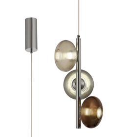 Quarrata's round three light multiple pendant is decorated with three glass in various colours; copper, champagne and smoked which each conceal the integral 4000K LEDs. The threaded effect on the prolate spheroid glass shape, emits a three dimensional pattern to further enrich the striking impact of the design. The switched, single LED wall lamps with matching polished chrome frames are available in with one of the three coloured glass on the pendant so a theme can be built around the preferred coloured glass.