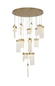 Our inventive designers have taken newly popular design concepts and combined them to make a stunning new range, Calci. The multiple pendant light, single pendants and wall lamp are available in a painted brush gold finish which offsets perfectly against the 3000K integral LEDs. Each staggered drop hosts a glass piece moulded to reflect crystallised ice which sits beneath the gold bands in which house the LEDs. These items are visually dazzling when illuminated yet still intriguing when the lights are not in use.