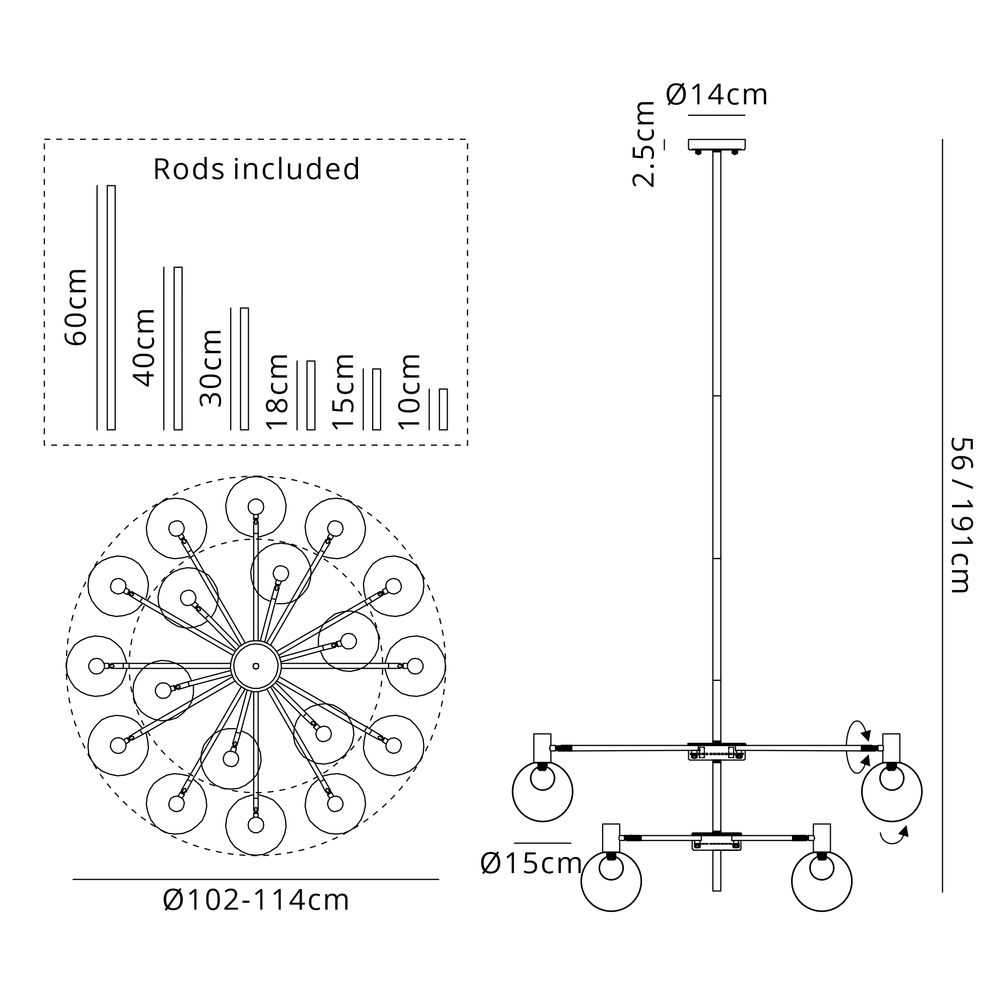 Fonzaso Fixed Pendant/Semi Flush Adjustable Arms (FRAME ONLY), 18 Light G9, Satin Nickel/Black