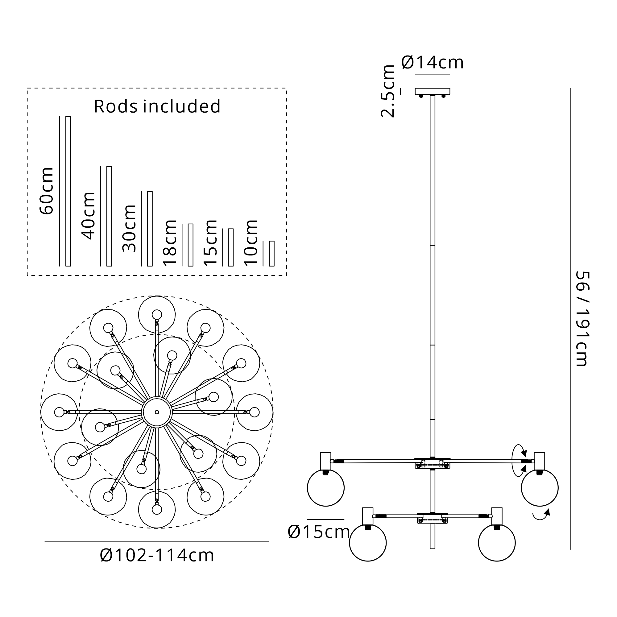 Fonzaso Fixed Pendant/Semi Flush Adjustable Arms (FRAME ONLY), 18 Light G9, Satin Nickel/Black