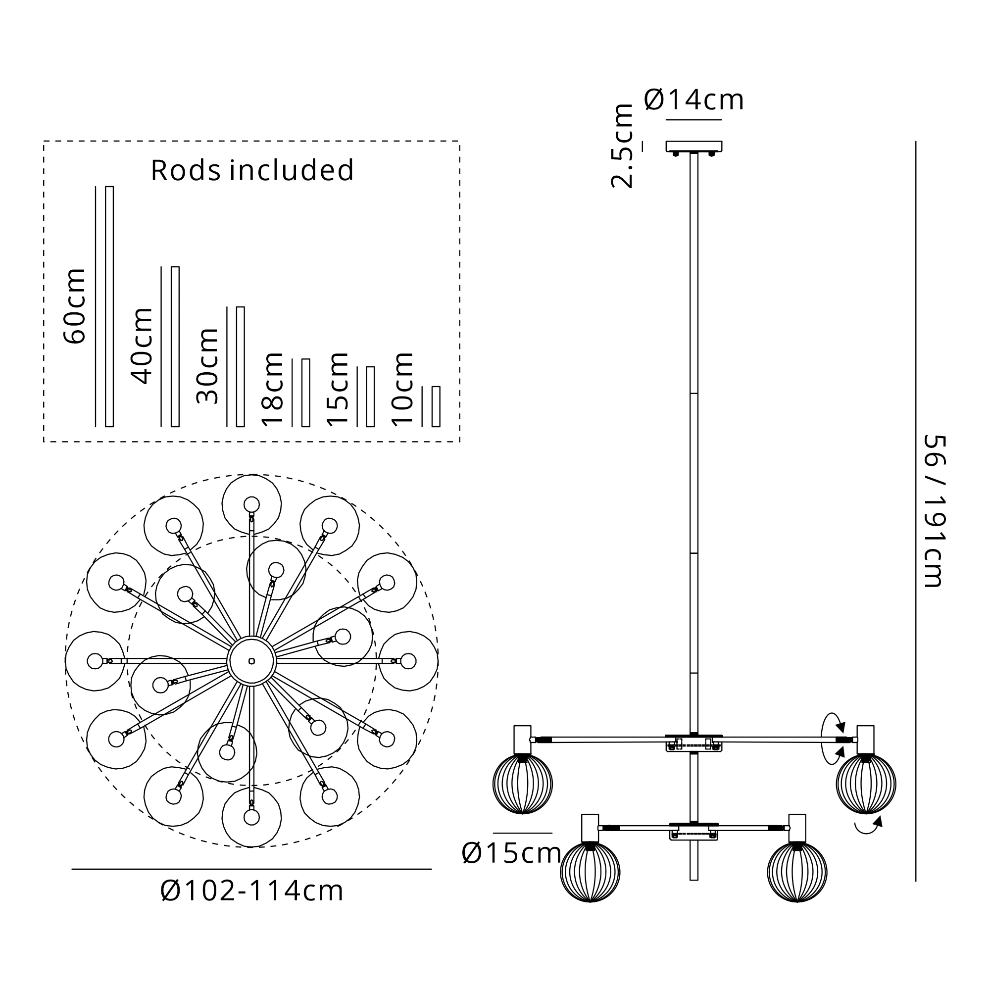 Fonzaso Fixed Pendant/Semi Flush Adjustable Arms (FRAME ONLY), 18 Light G9, Satin Nickel/Black