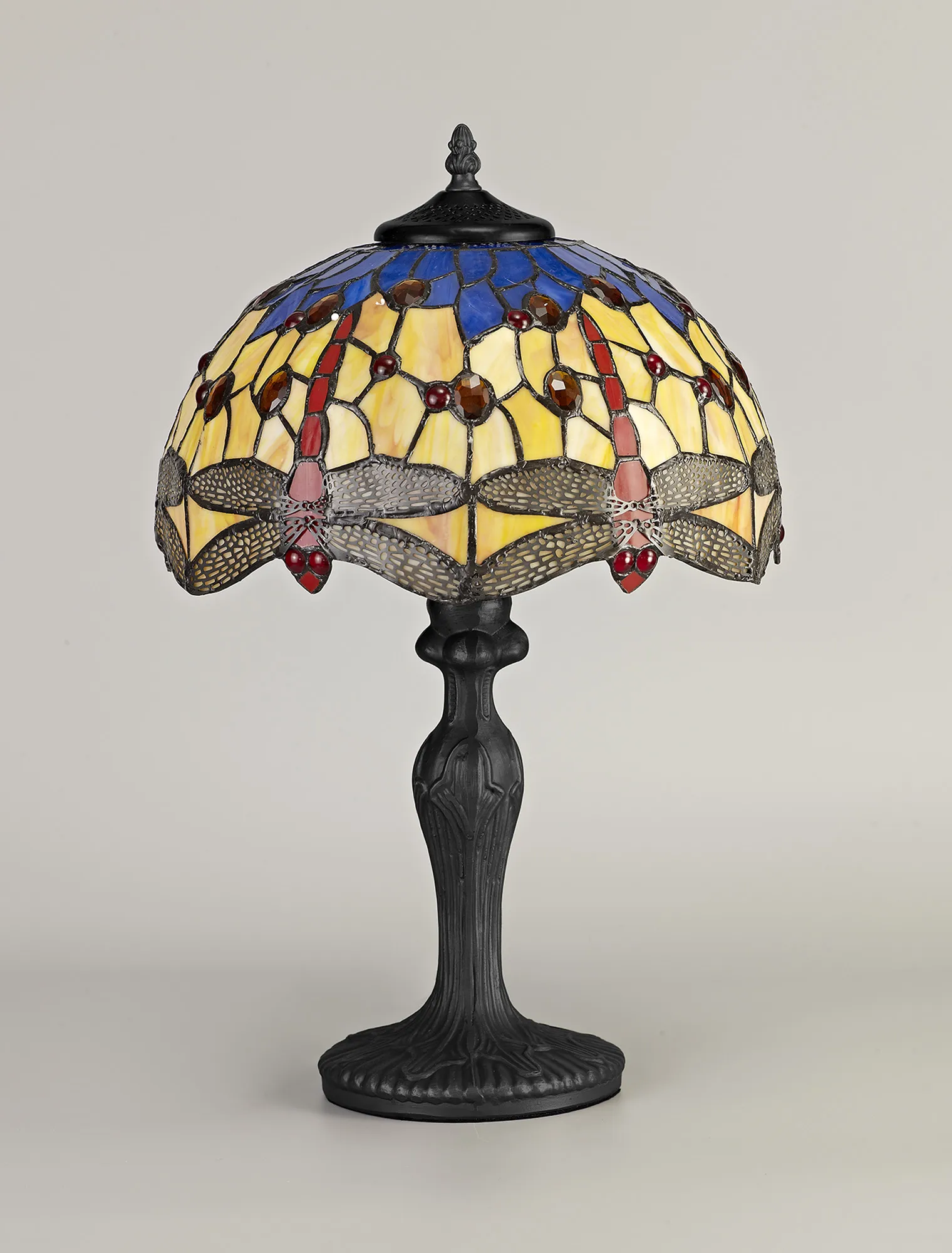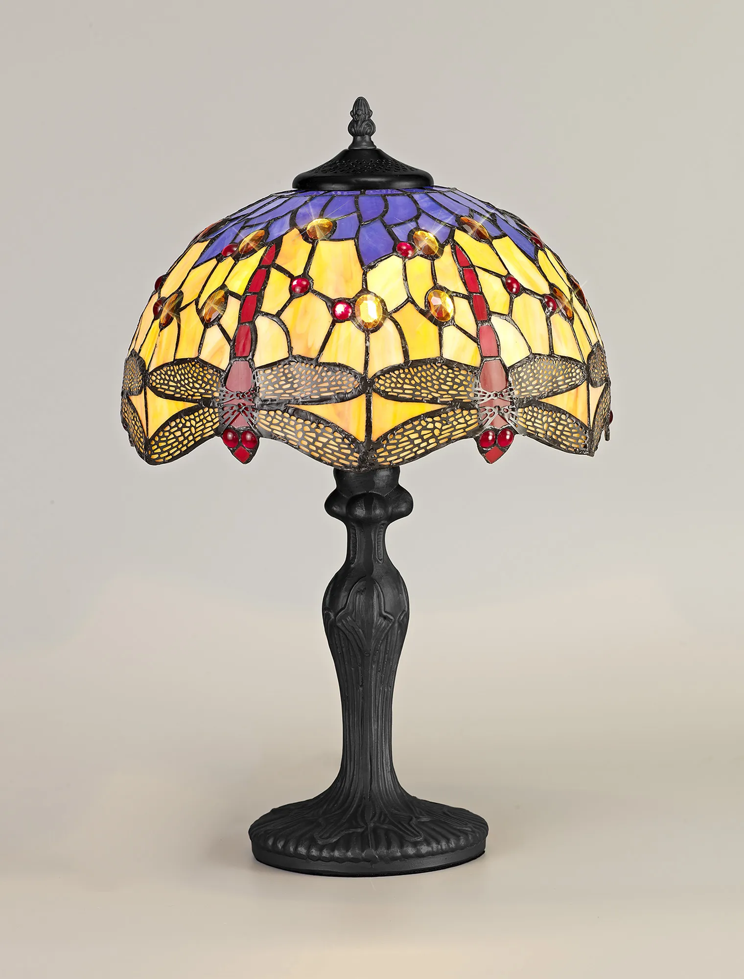 Gambassi's stunning Tiffany glass design features the classic dragonfly form, effortlessly fashioned into the overall mosaic collection of Tiffany glass pieces. Reinterpreting an old-fashioned concept, additional crystal pieces have been inserted into the glass shades providing a touch of modern sparkle and elegance. Available in two colour finishes this beautiful pattern is featured across a comprehensive variety of lighting solutions.