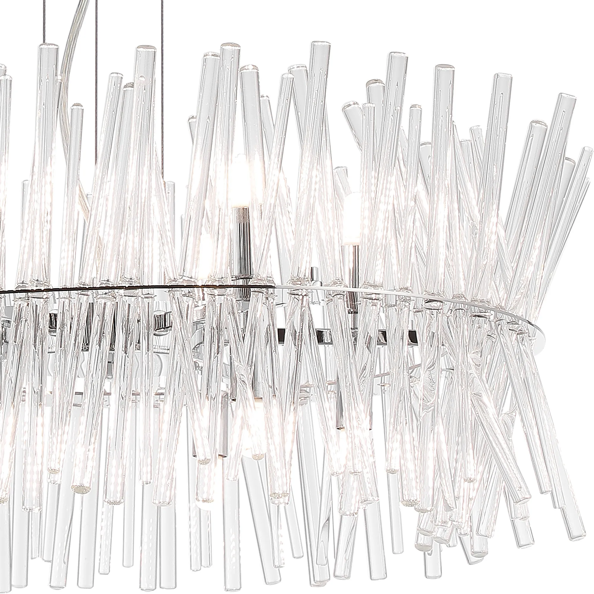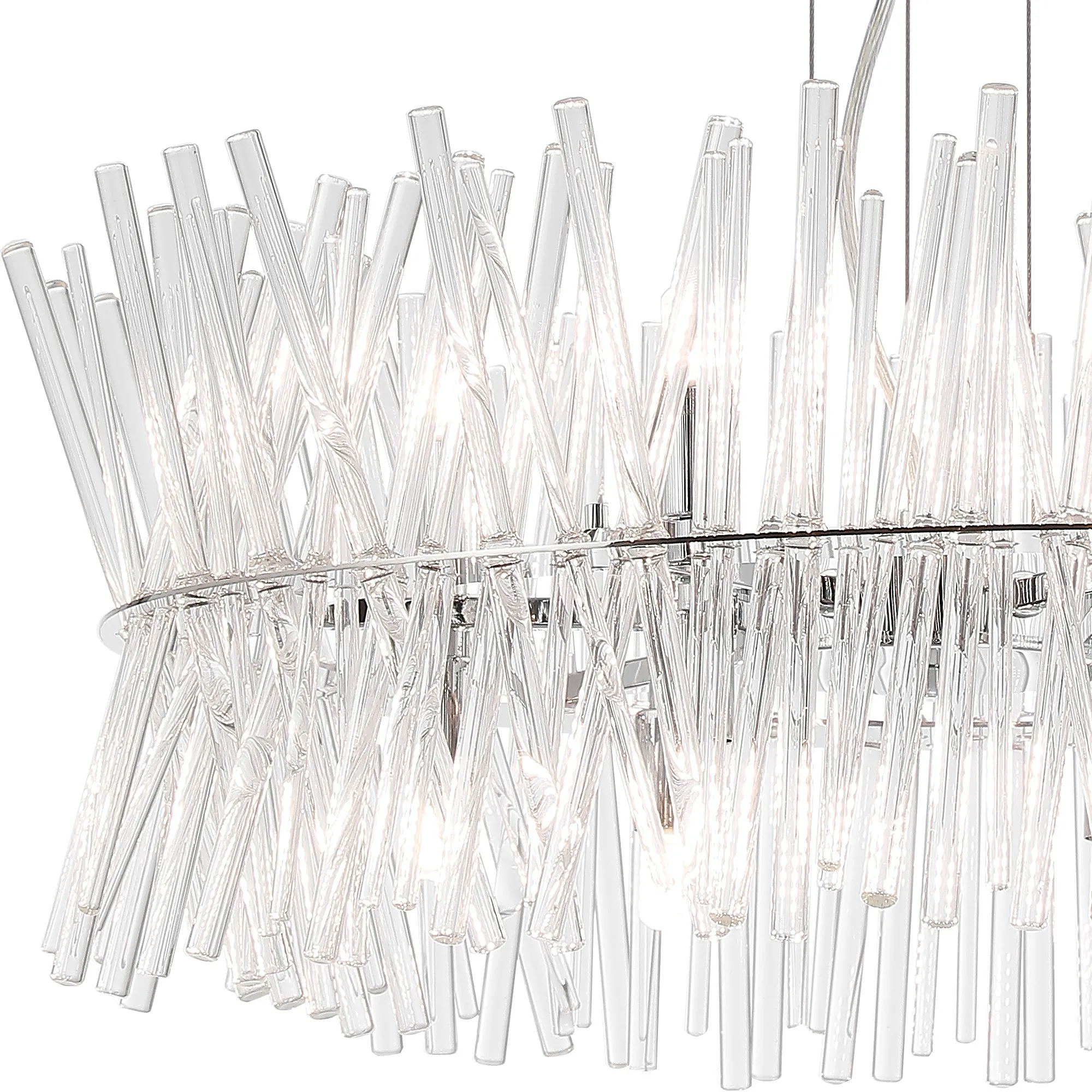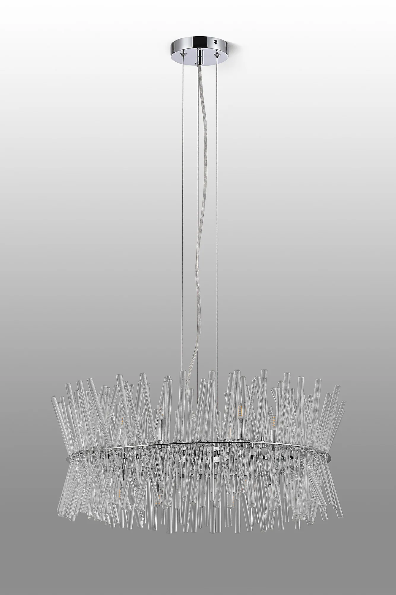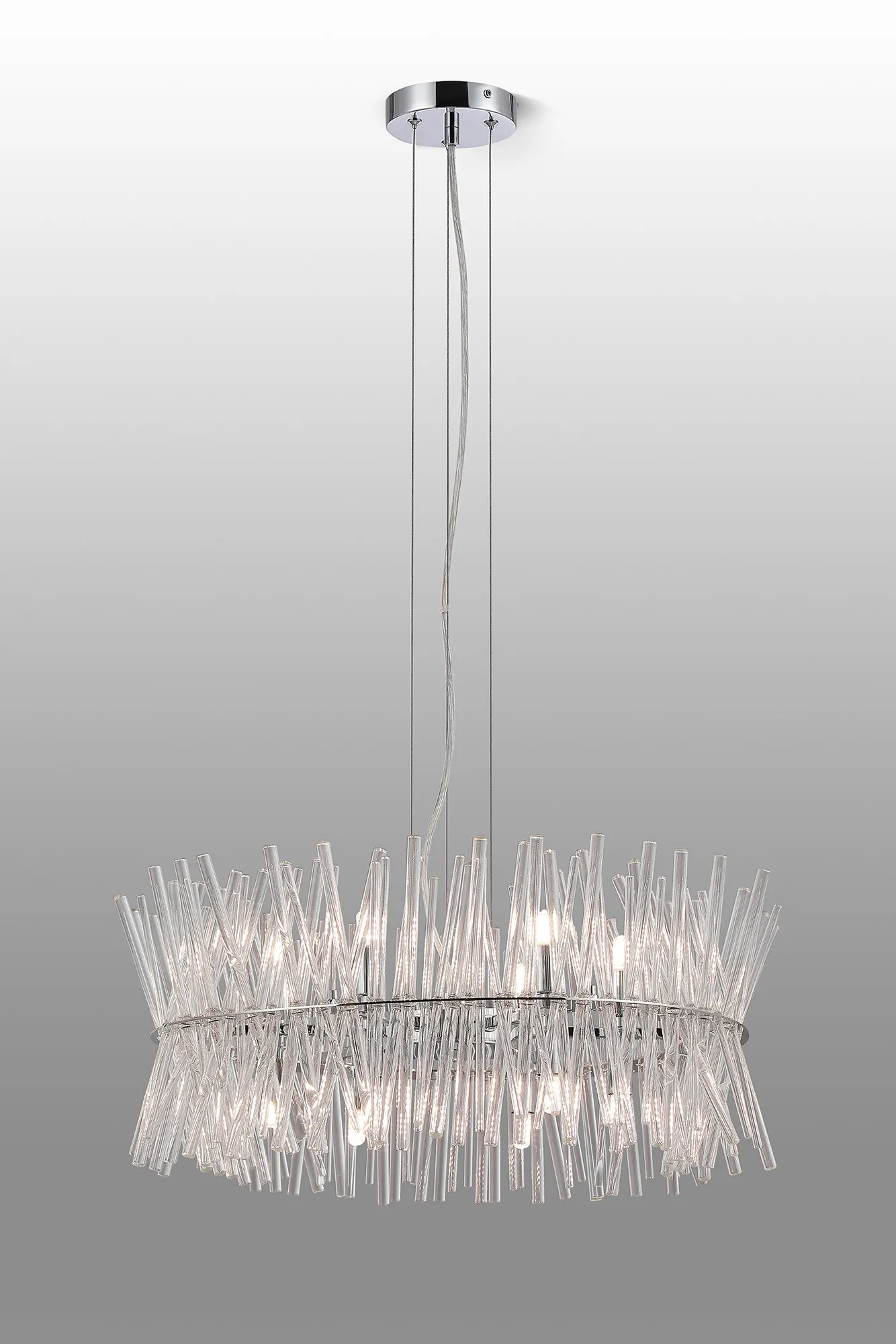 Venezia is beautifully designed collection of light fixtures. With three different sizes in a polished chrome finish, these fittings likely offer versatility for various spaces, from small nooks to larger rooms. The structured glass that resembles a straw bundle provides a unique textural element, adding an organic touch to the modern chrome. This combination works well in contemporary interiors or spaces that seek to blend natural forms with sleek metallic finishes.