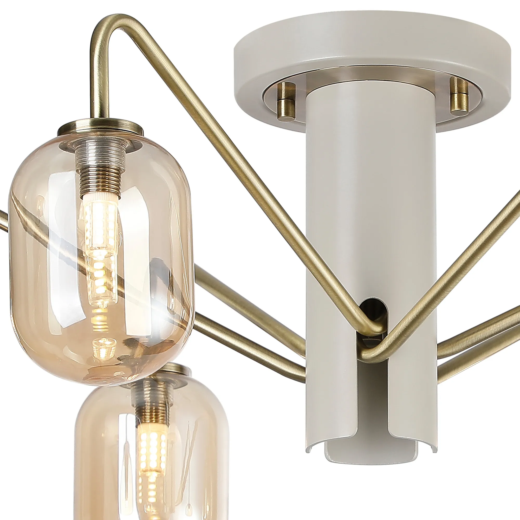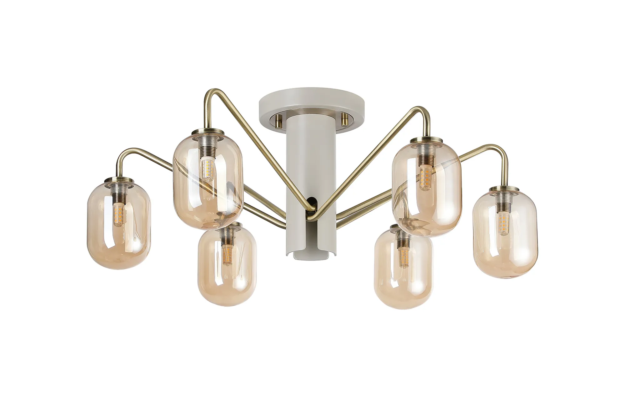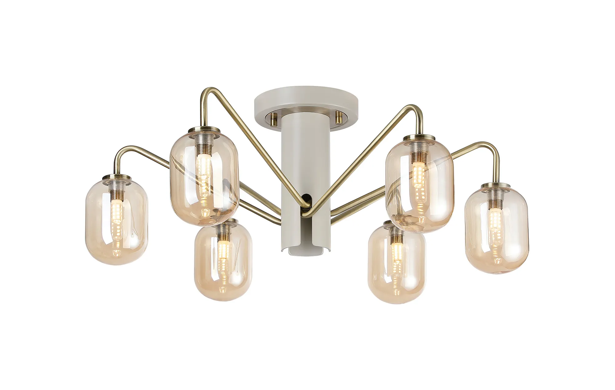 OTHER Vas 57cm Semi-Flush Ceiling Light, 6 x G9, Painted Beige/Antique Brass/Amber Smooth Tubular Glass