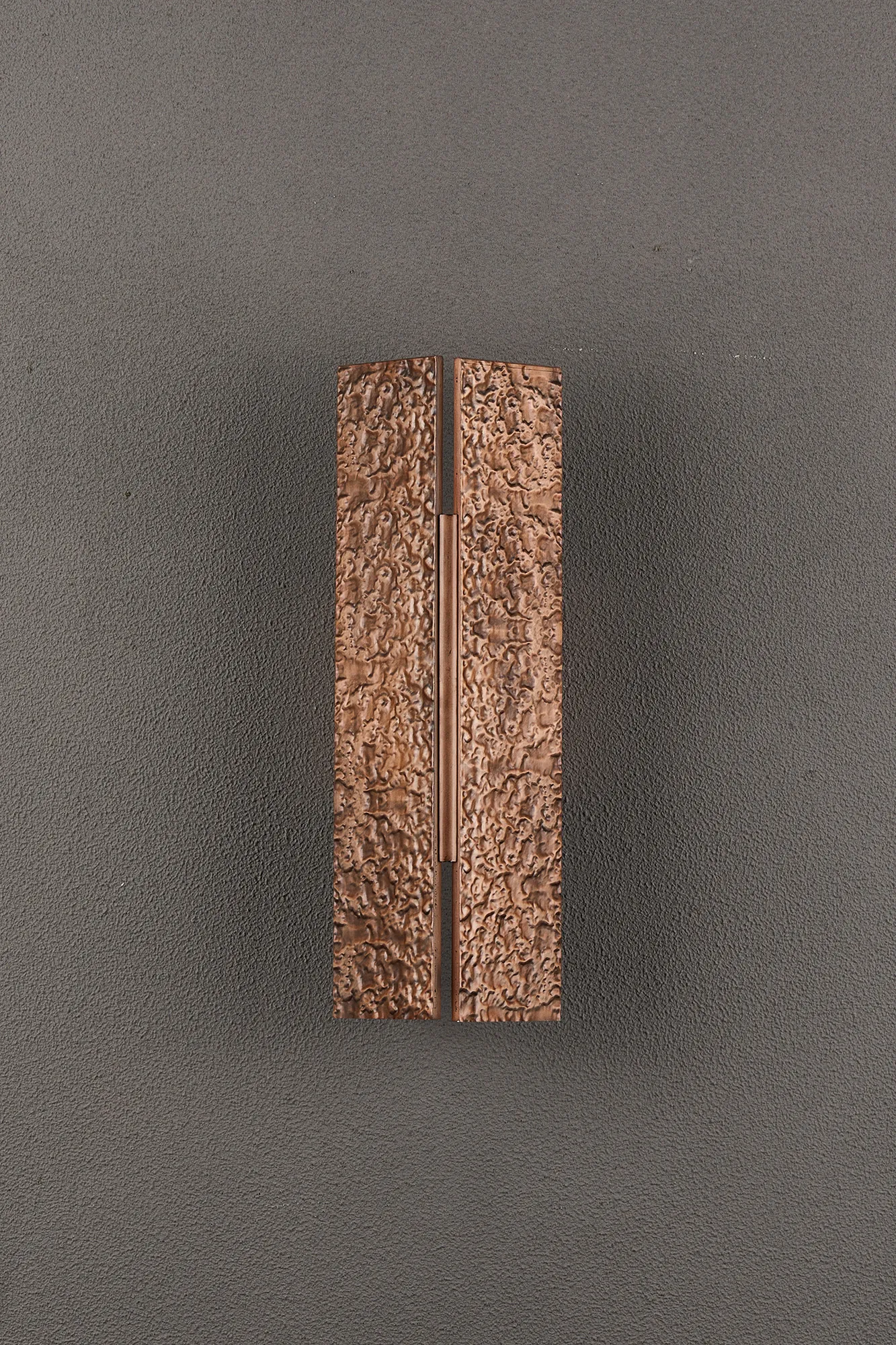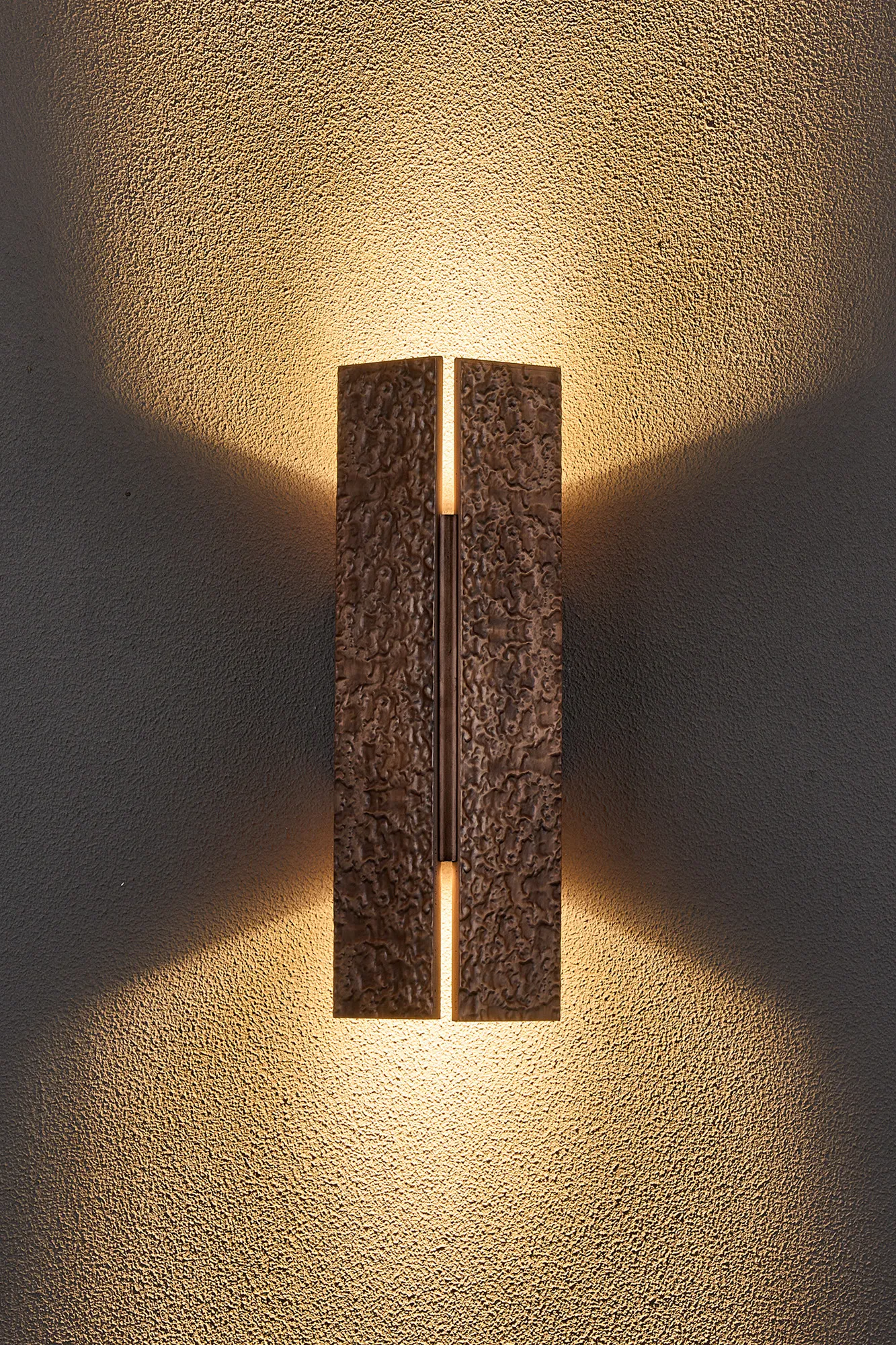Stra wall lamps are a distinguished lighting design to enhance both indoor and outdoor spaces with their IP54 rating. They feature dual GU10 lampholders and are available in three metallic finishes: antique brass, matt bronze and red antique copper. Offering a selection of hinged shade styles and sizes, including rectangular or curved. The ancient textured effect, in harmony with the warm colour tones, create a truly enchanting concept.