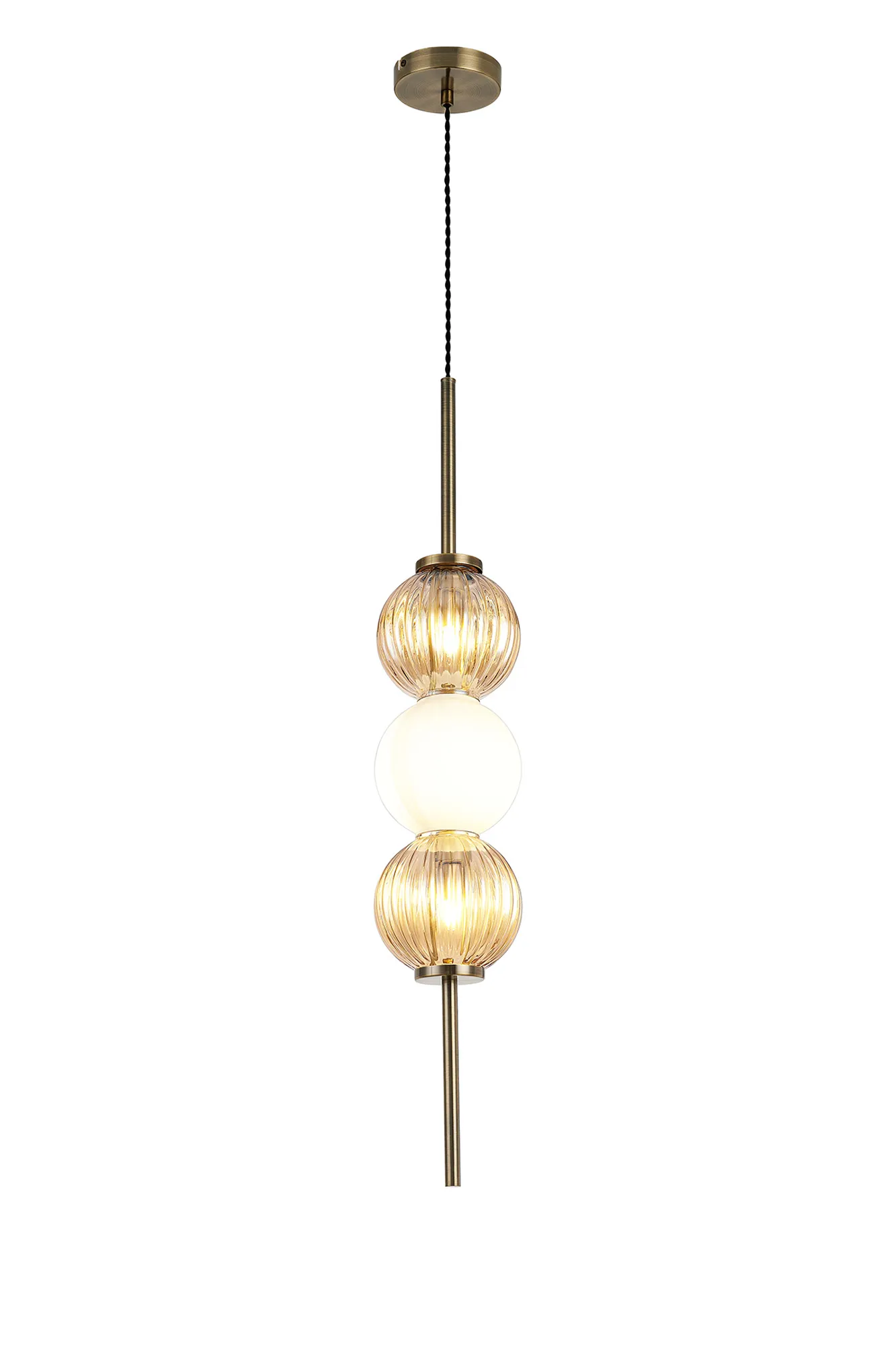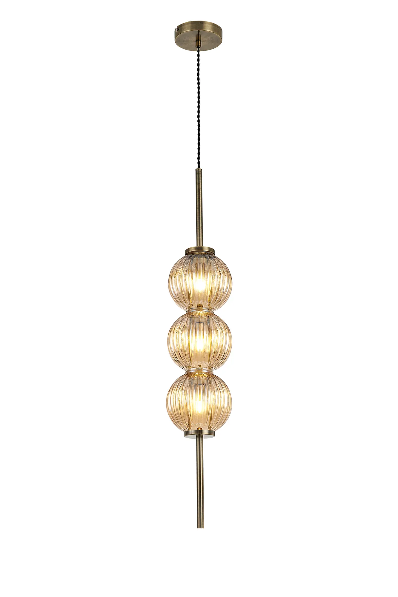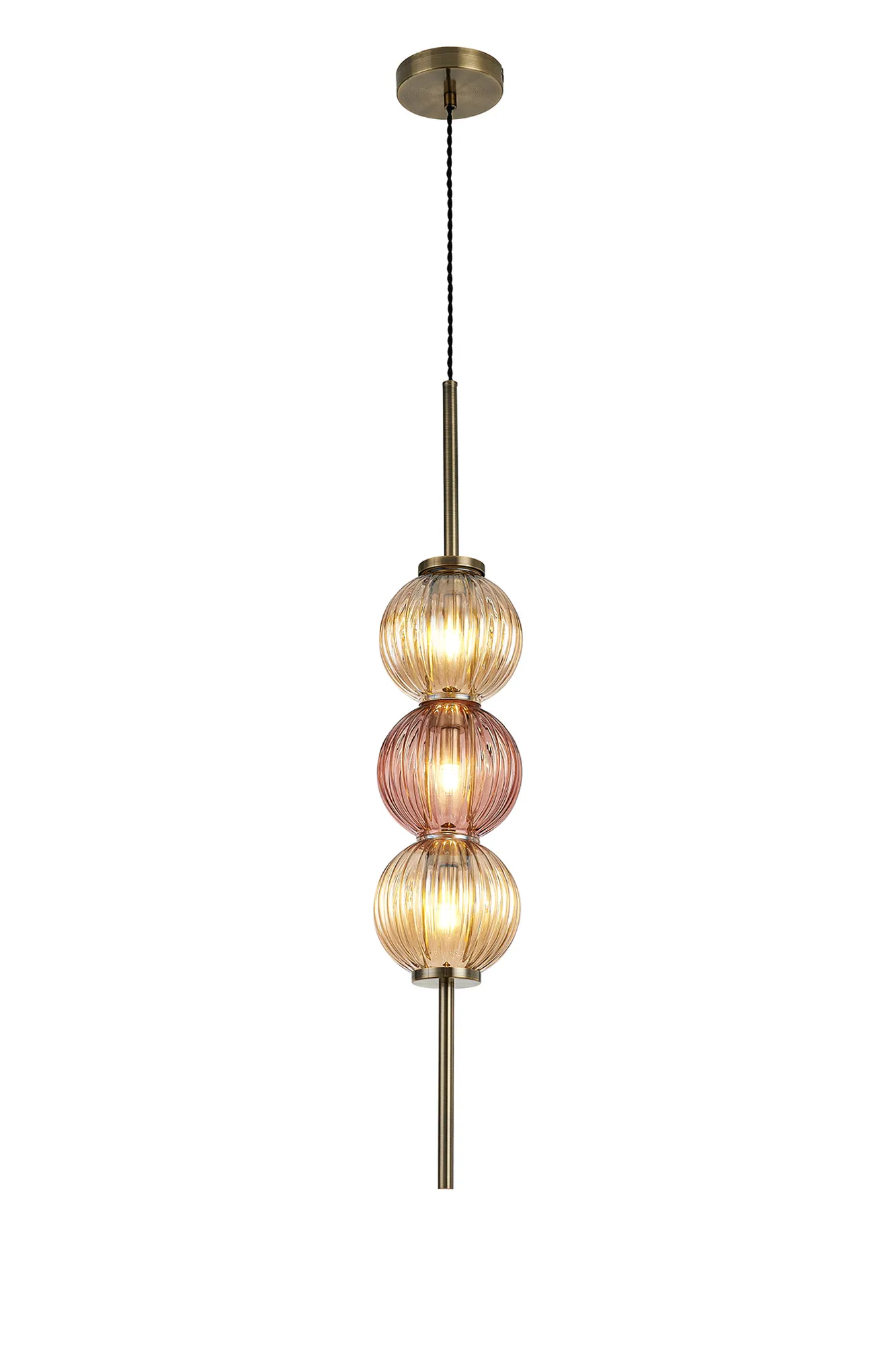 The pendant, table and floor lamp featured in the Fauglia range host a range of colour combinations with their globe glass; colourful and playful with Blue, Pink and Green or subtle and sleek with Smoke and Amber. These glass pieces, encircling the G9 lamp holders, have a ridged moulding enhancing the luminous sheen given off their coloured tint. The glass fixes to the slim tubular stem, finished in antique brass, in such a way that imitates beads being threaded along string. This peculiar composition can be partnered with one of the two wall lamps available with either a smoked or amber glass to tie in with the pendant, table and floor lamp.