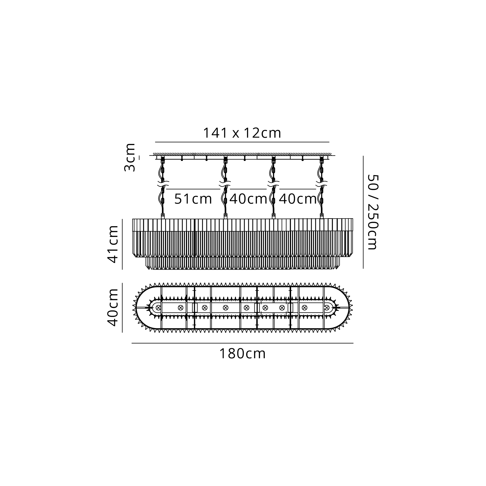 Magliano Modular 250 x 40cm Linear Pendant, 13 Light E14, Brass/Smoked Sculpted Glass