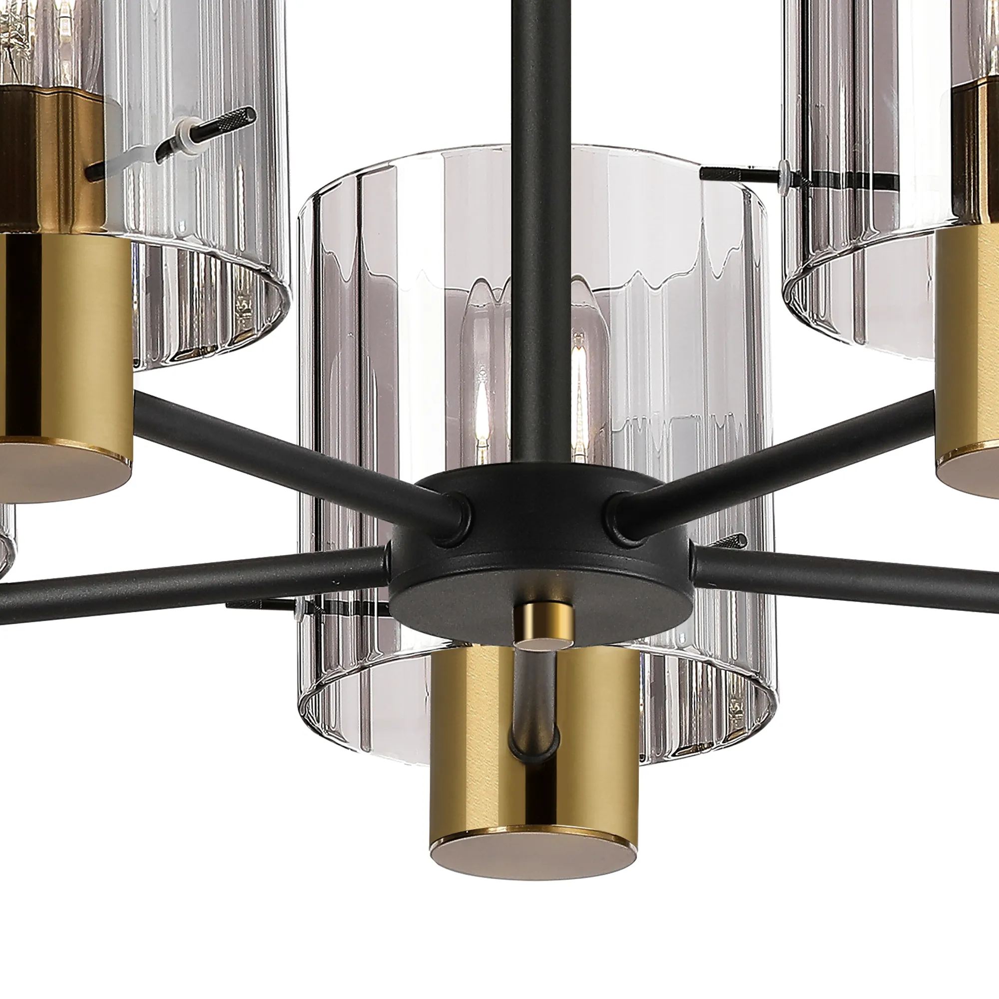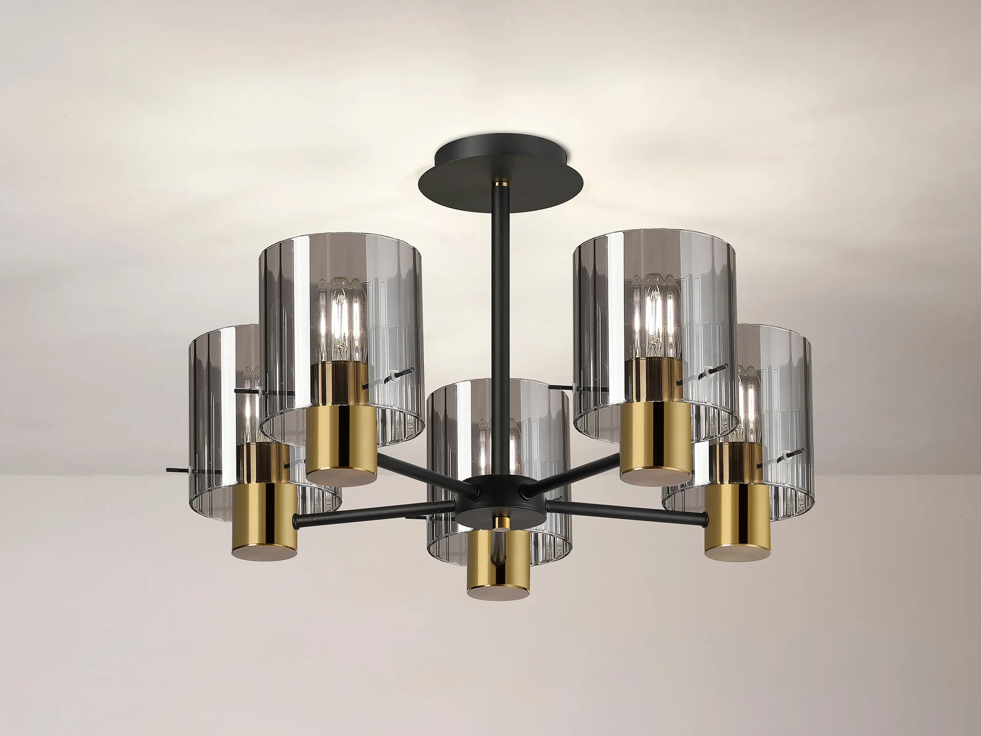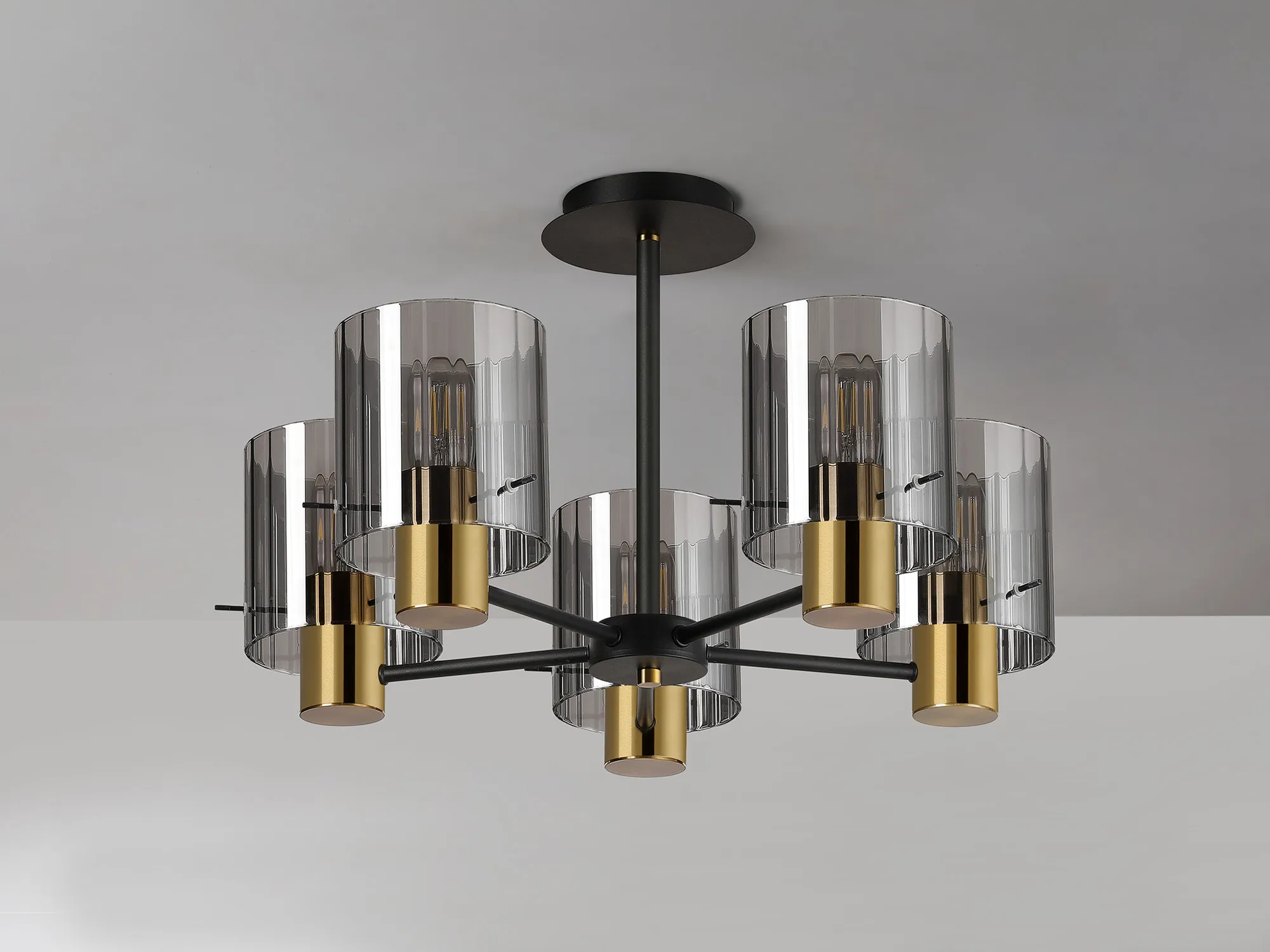 The Arienzo range is a refined expression of contemporary design, offering a complete suite of lighting options to elevate any interior. From the sleek 1-light pendant to the showstopping 9-light pendant, the collection also includes semi-flush fittings, matching wall lights, table lamps, and floor lamps-ideal for creating a cohesive and sophisticated lighting scheme throughout your home. Each piece features ribbed cylindrical glass shades, available in a selection of smoked, clear, frosted, or gloss white finishes, with a choice of narrow or wide inner line detailing for added texture and visual interest. The glass is elegantly suspended by slender rods, providing a clean, architectural look while securely supporting each shade. The range is beautifully finished in a striking combination of sand black and brass, offering a bold yet timeless contrast. Designed for both ambient and accent lighting, the Modern Elegance collection delivers the perfect balance of style, function, and luxury.