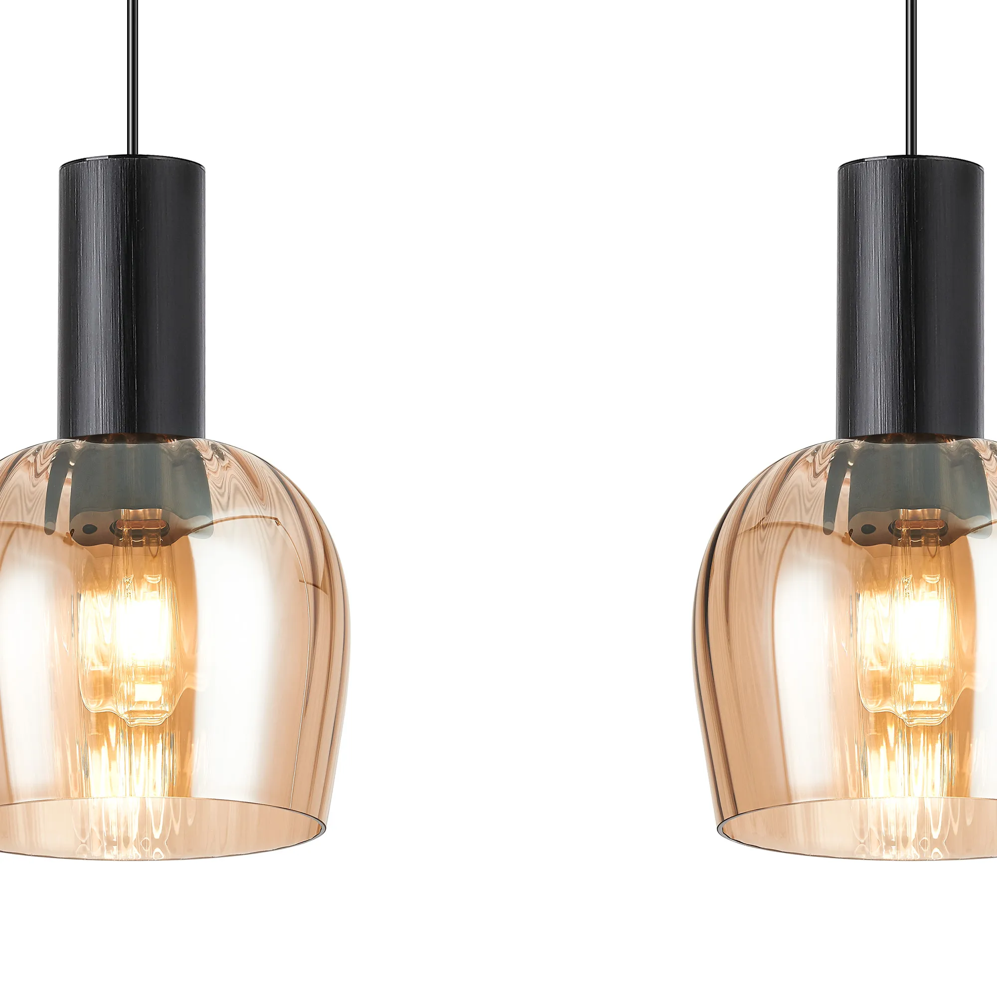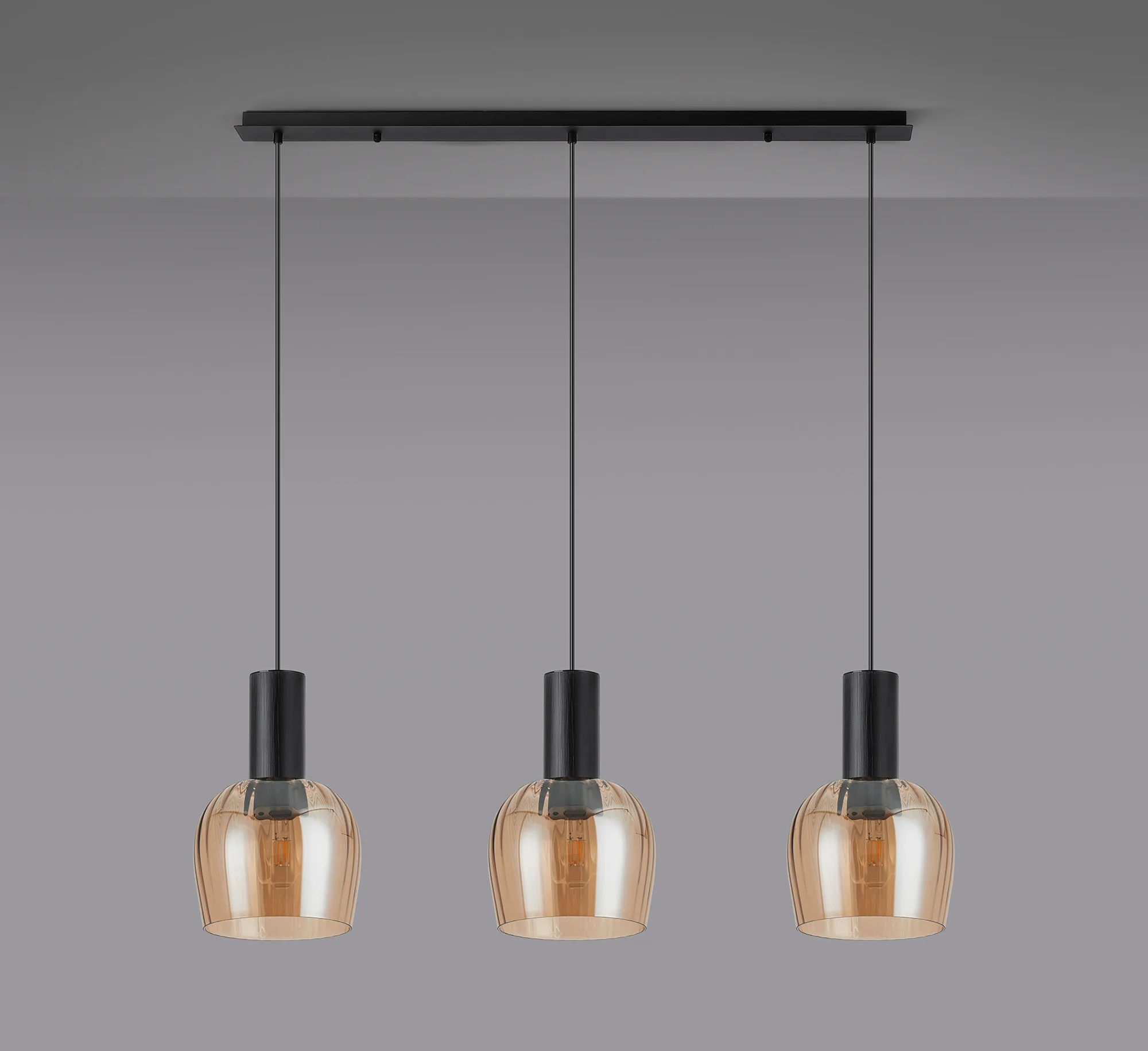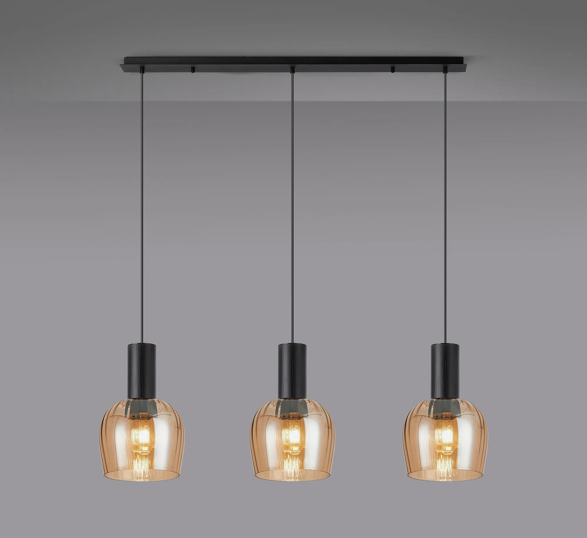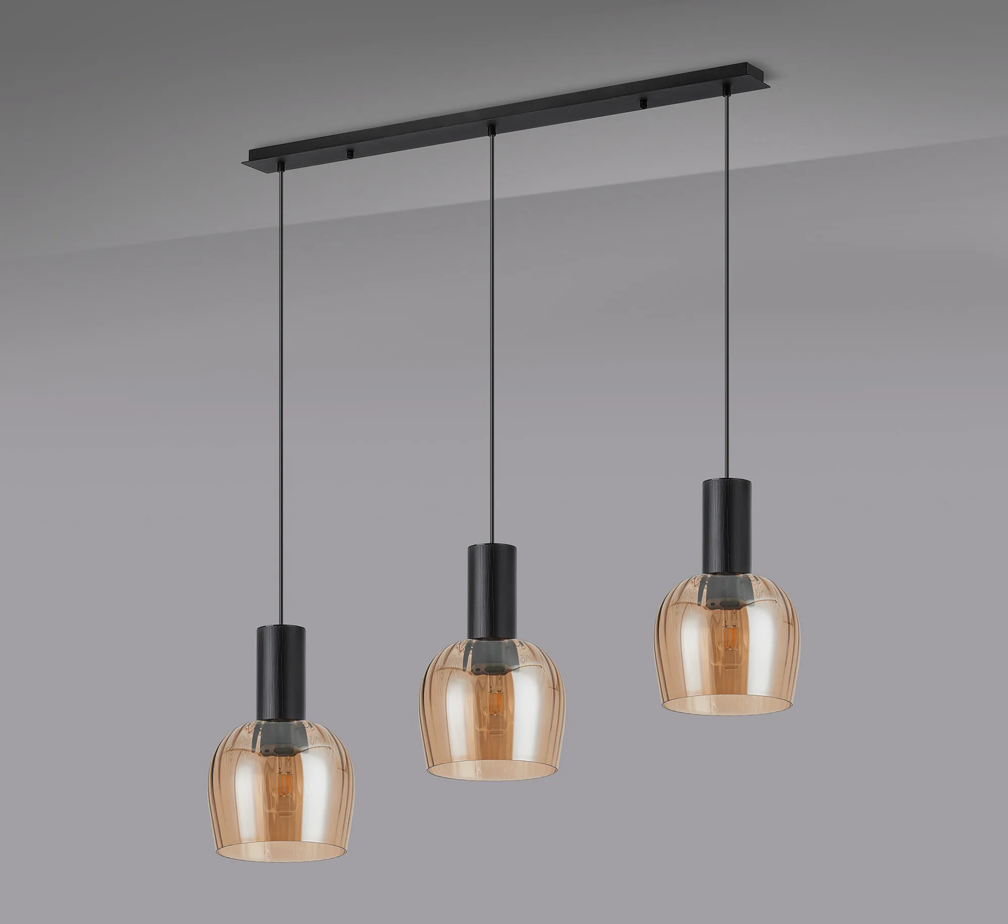 OTHER Albanella 1.1m Linear Pendant, 3 x E27, Satin Black/Amber Ribbed Wine Glass