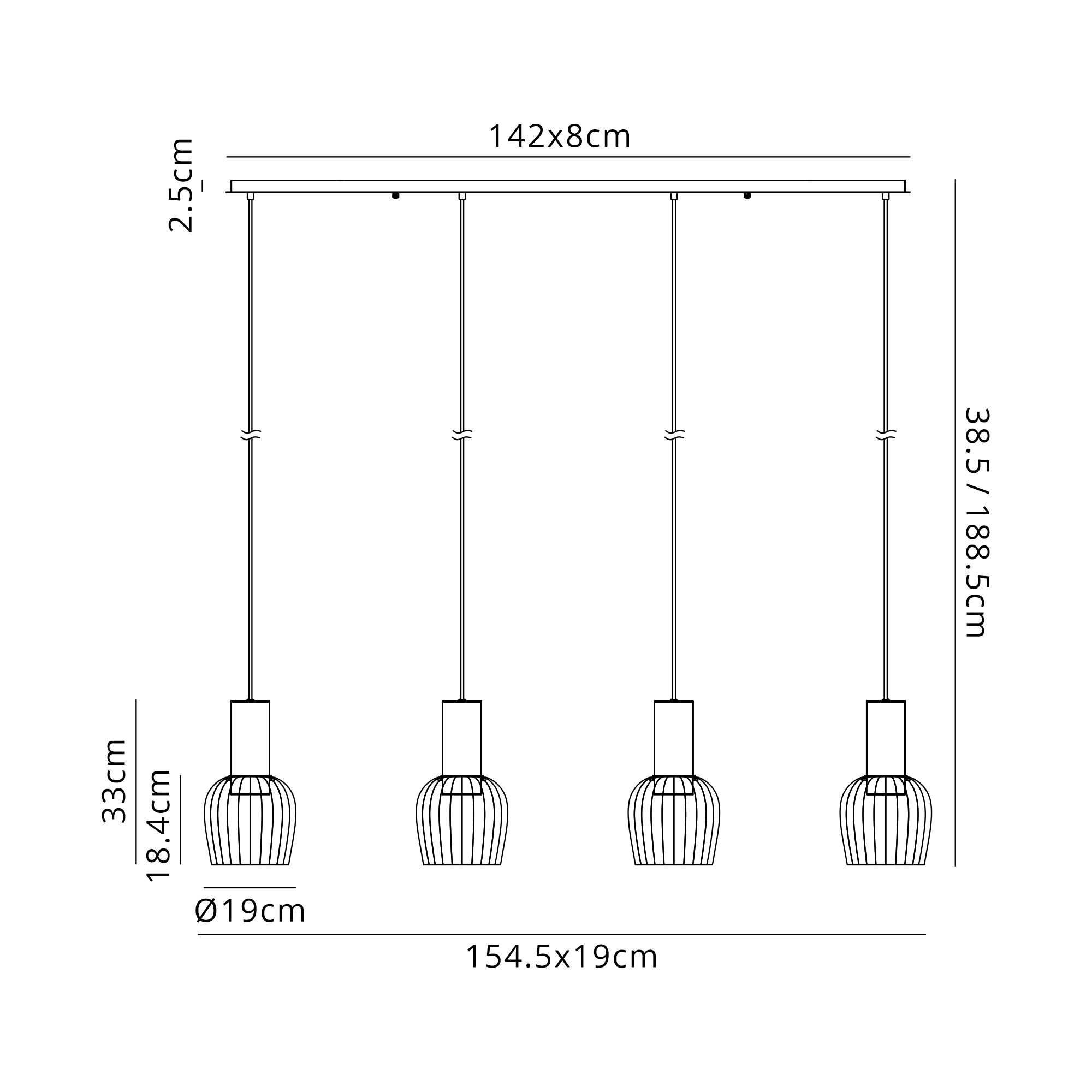 Albanella 105.5 x 23.5cm Linear Ceiling Light, 4 x E27, Gun Metal/Satin Black/Amber Ribbed Wine Glass