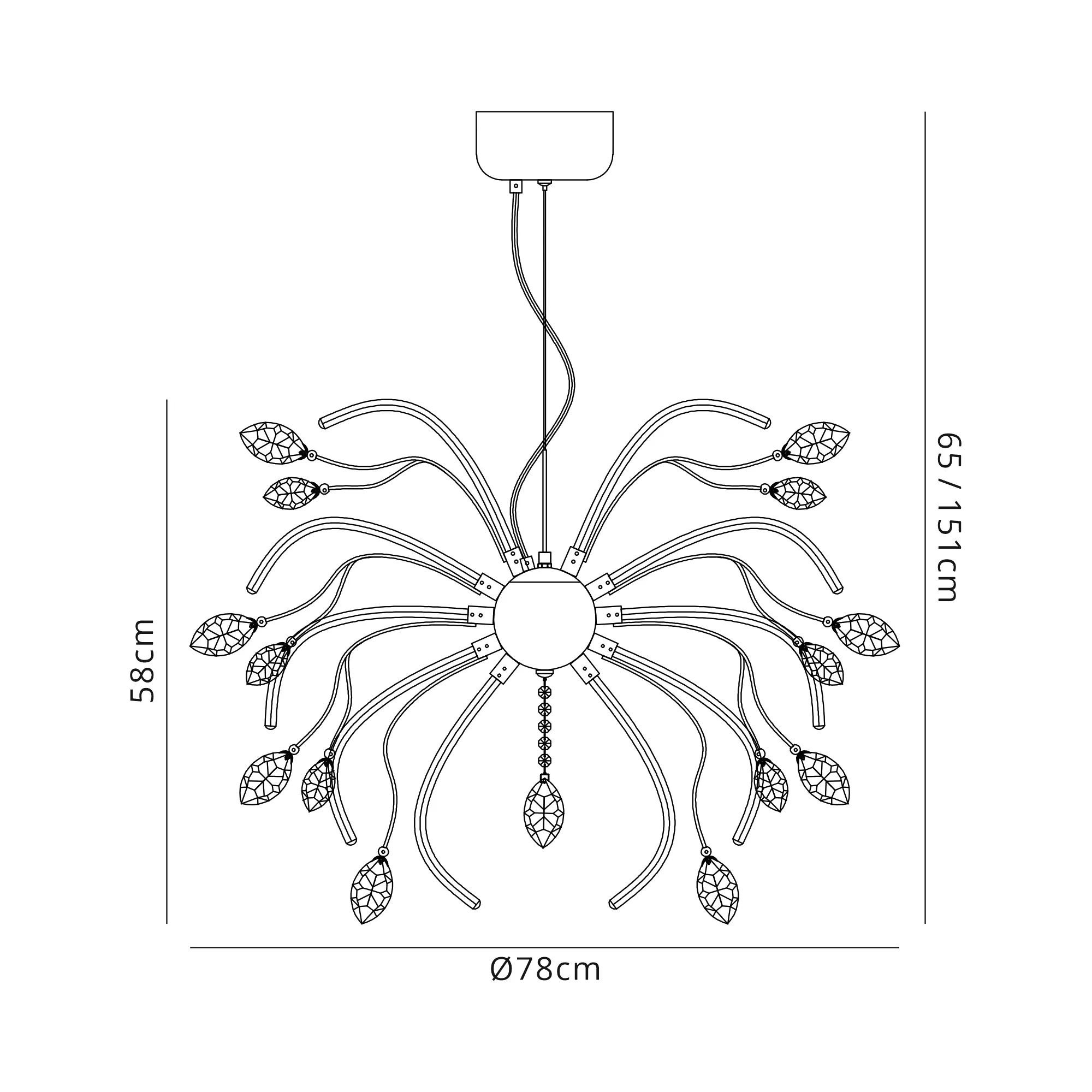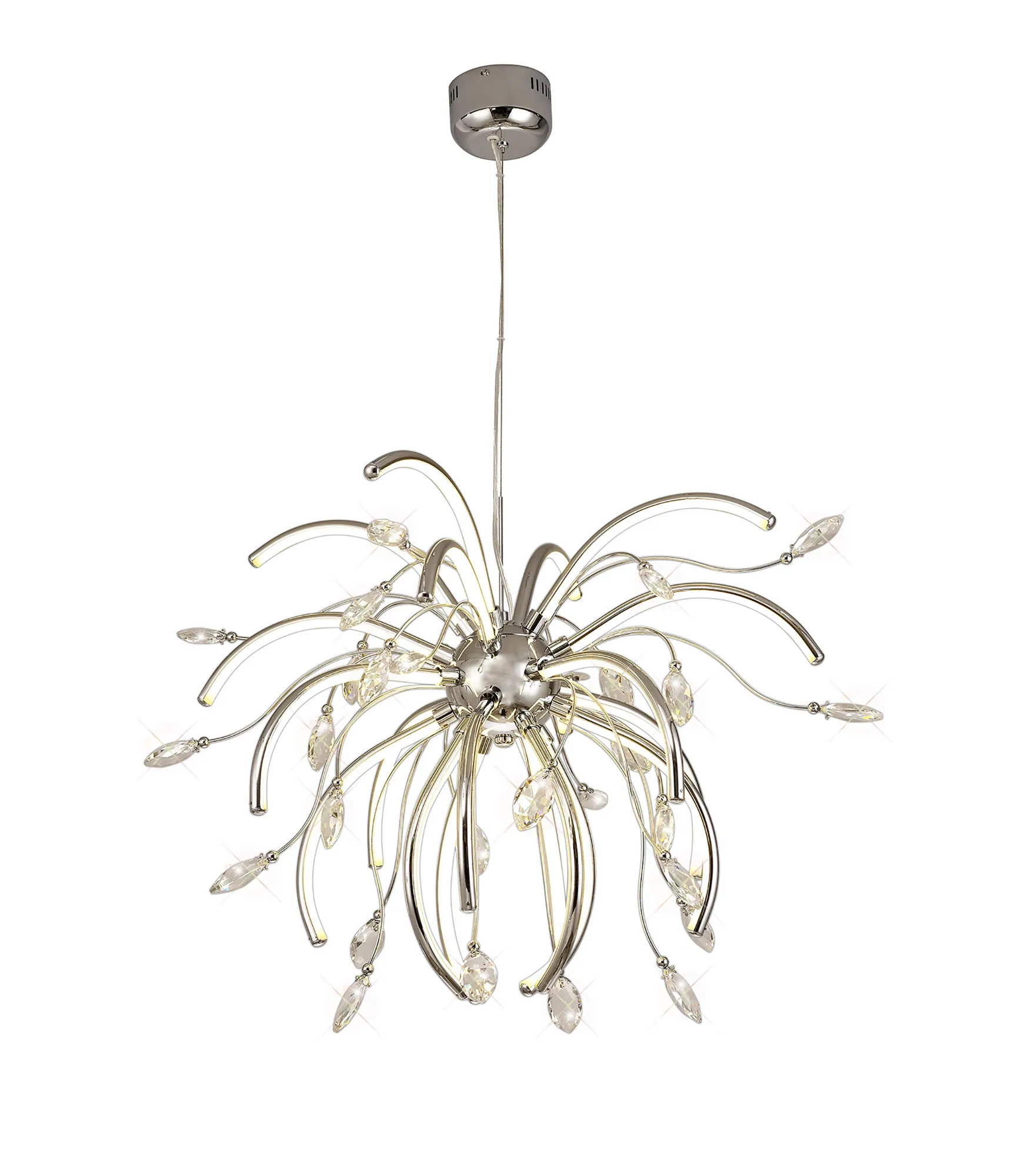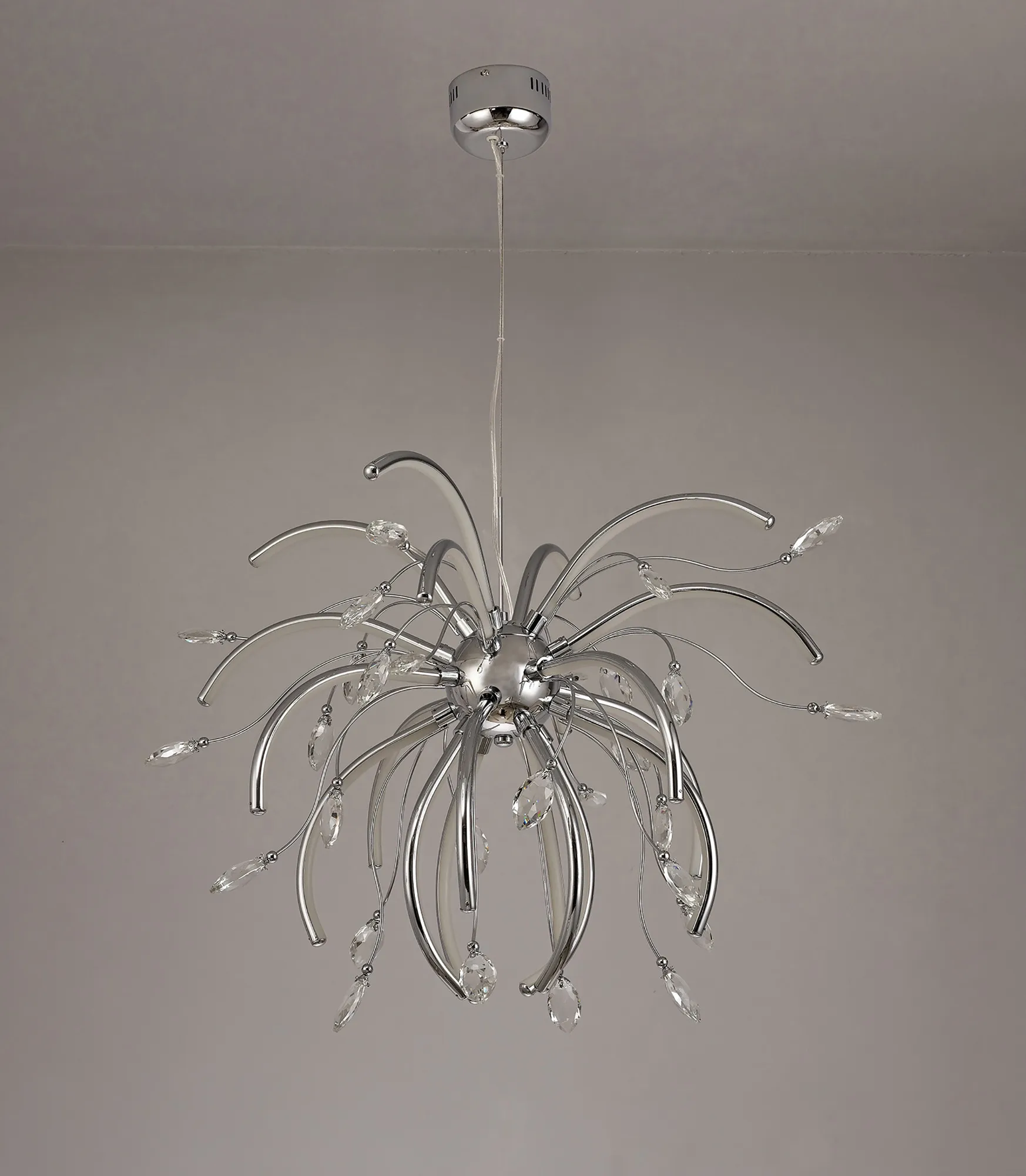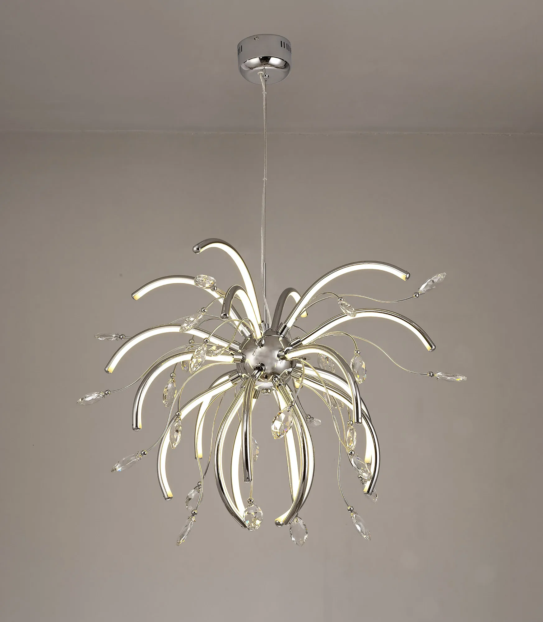 Catini breaks away from the common methods of displaying integral LED lighting which have now become the norm for modern designs. The warm light from the LEDs are reflected throughout the fitting as a whole, diffused along the curved chrome arms protruding from the ceiling plate. The curvature of these arms first sending the light in an outwards direction then begins to throw the light at an upward angle. This ensures the leaf shaped clear crystals, fixed to the ends of the polished chrome waved stems, are enhanced by the LED light to produce a dazzling effect. With various lighting options available, Catini's sophisticated elegance is striking even when unlit.