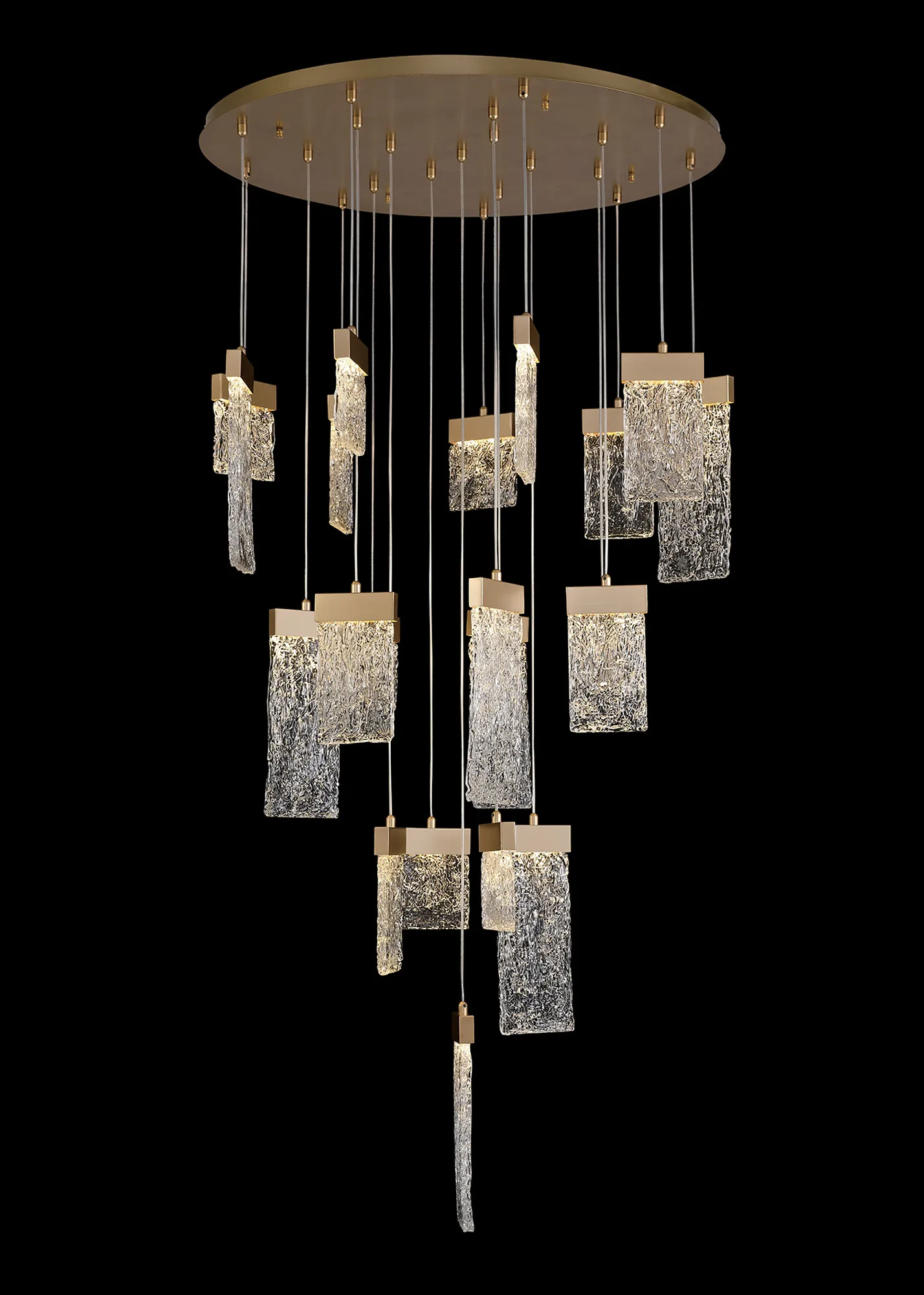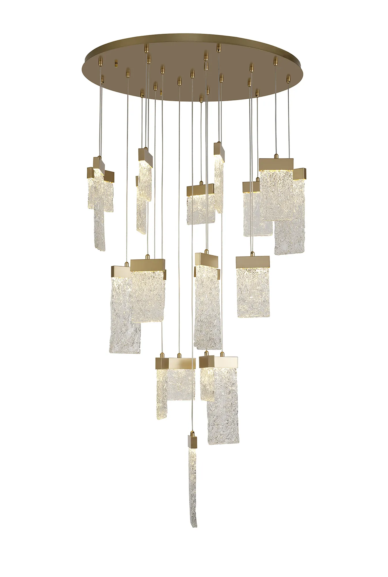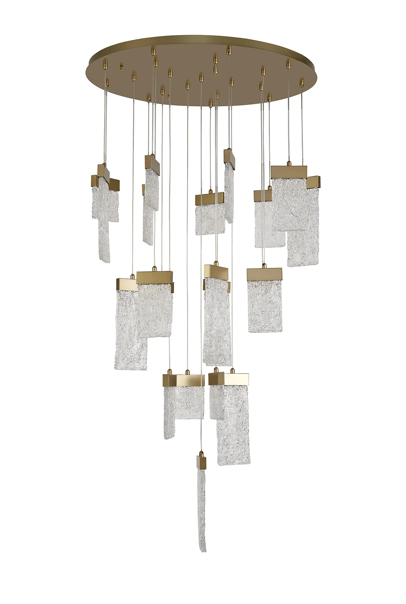 Our inventive designers have taken newly popular design concepts and combined them to make a stunning new range, Calci. The multiple pendant light, single pendants and wall lamp are available in a painted brush gold finish which offsets perfectly against the 3000K integral LEDs. Each staggered drop hosts a glass piece moulded to reflect crystallised ice which sits beneath the gold bands in which house the LEDs. These items are visually dazzling when illuminated yet still intriguing when the lights are not in use.