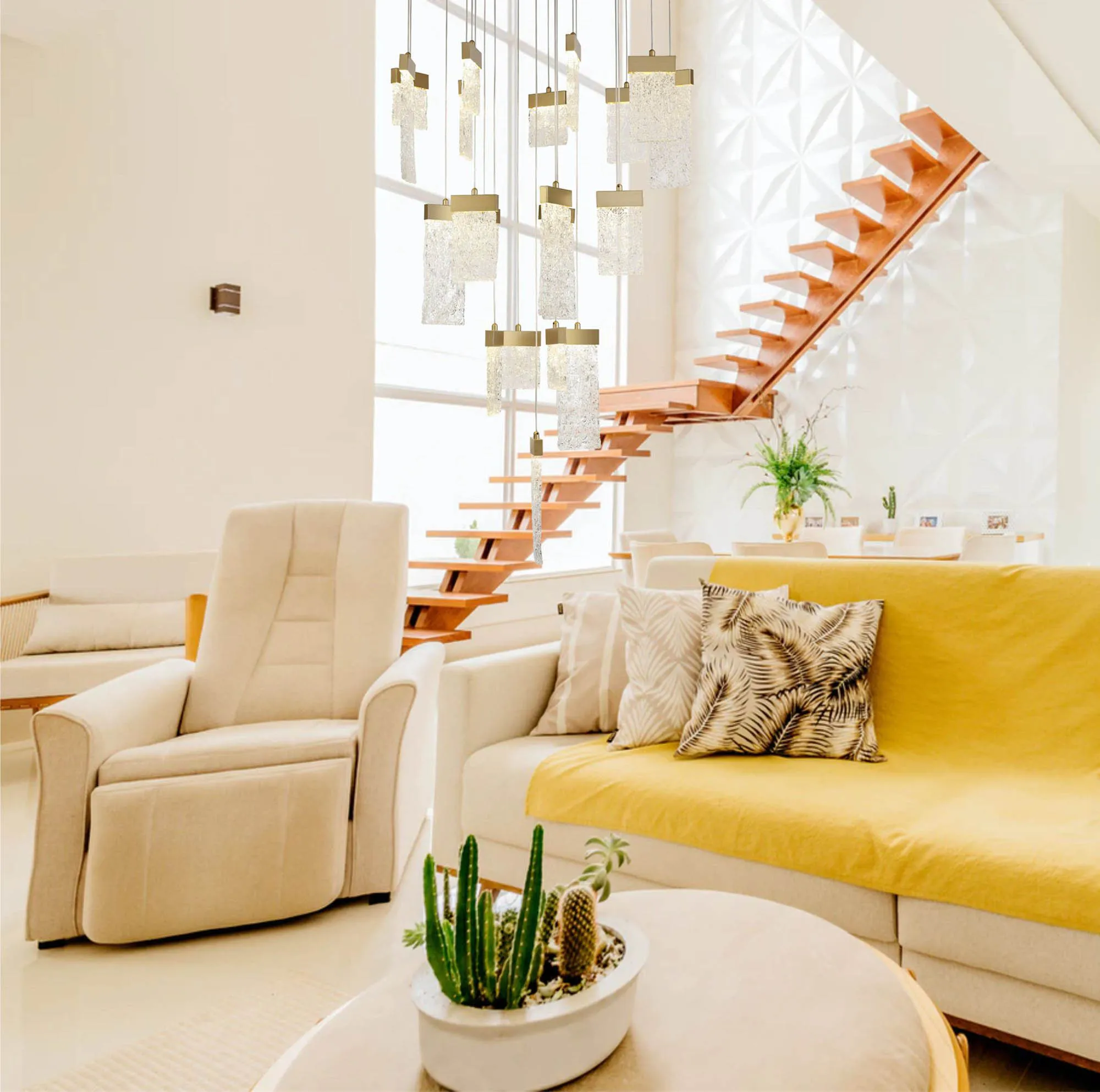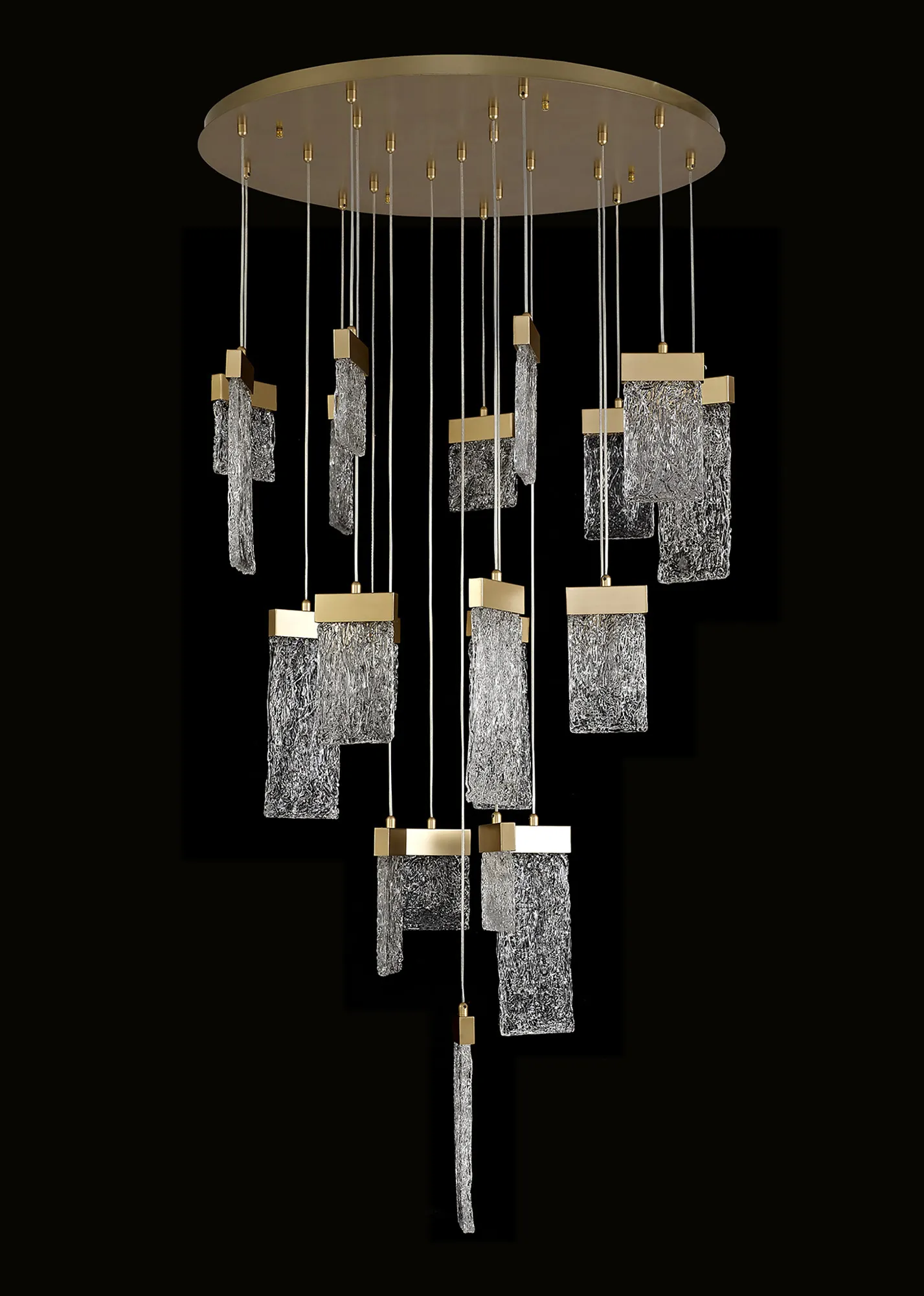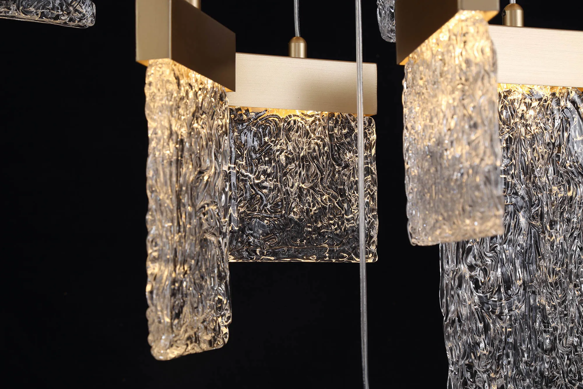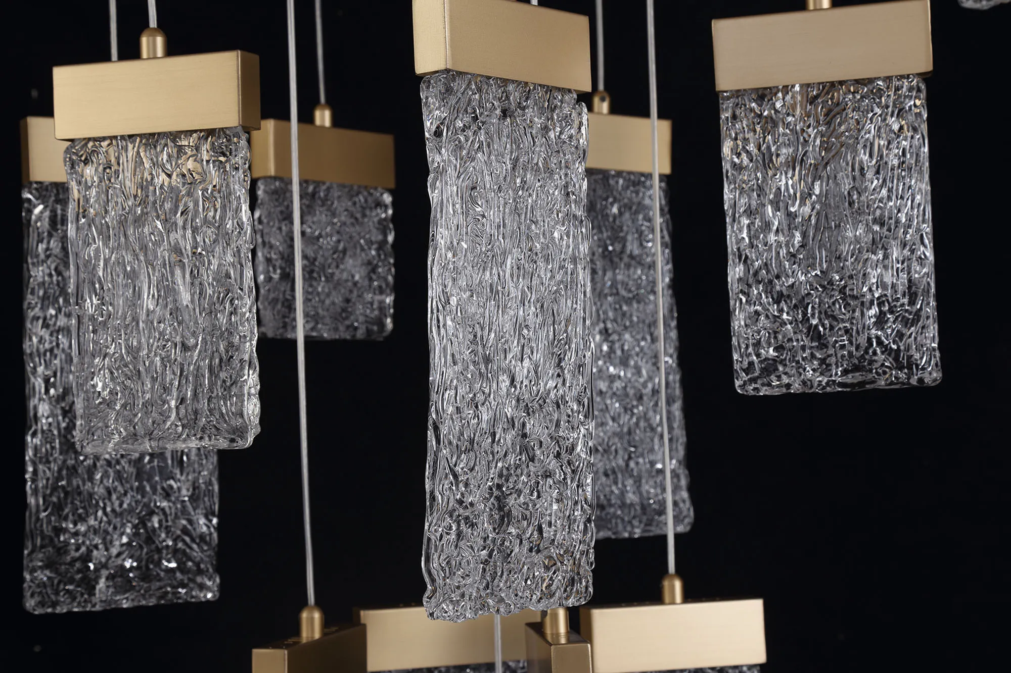 Our inventive designers have taken newly popular design concepts and combined them to make a stunning new range, Calci. The multiple pendant light, single pendants and wall lamp are available in a painted brush gold finish which offsets perfectly against the 3000K integral LEDs. Each staggered drop hosts a glass piece moulded to reflect crystallised ice which sits beneath the gold bands in which house the LEDs. These items are visually dazzling when illuminated yet still intriguing when the lights are not in use.