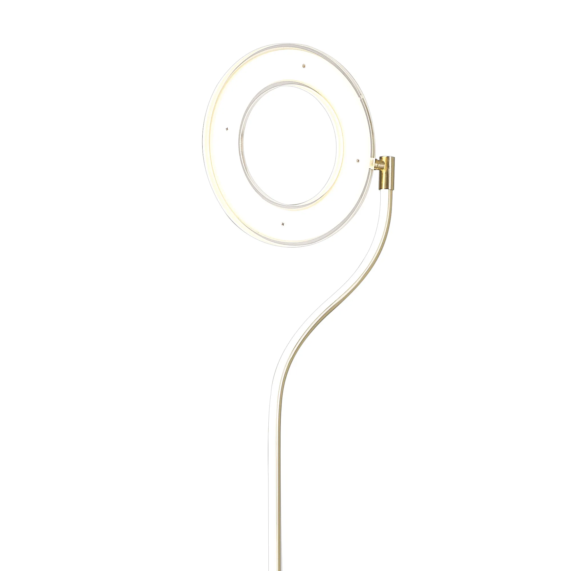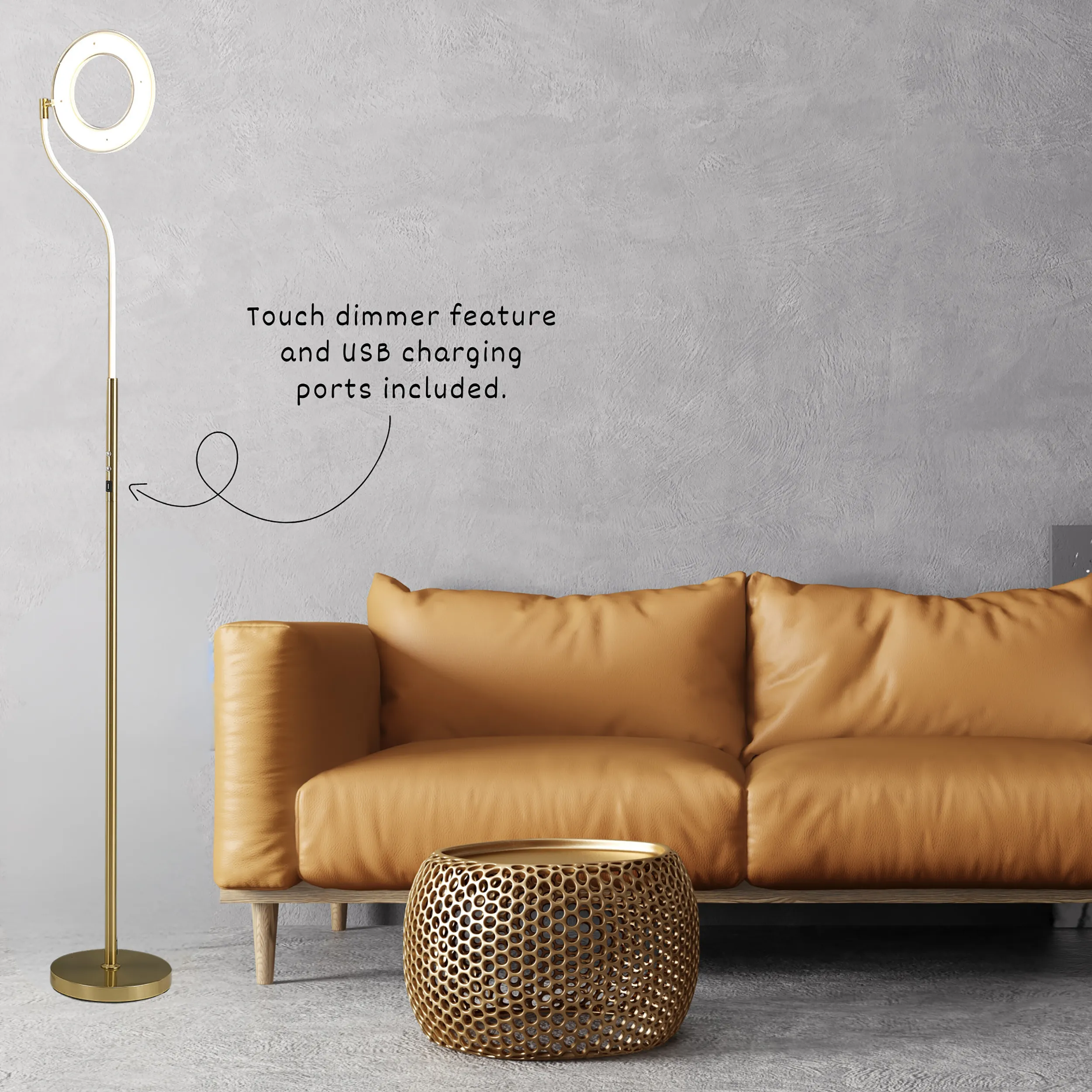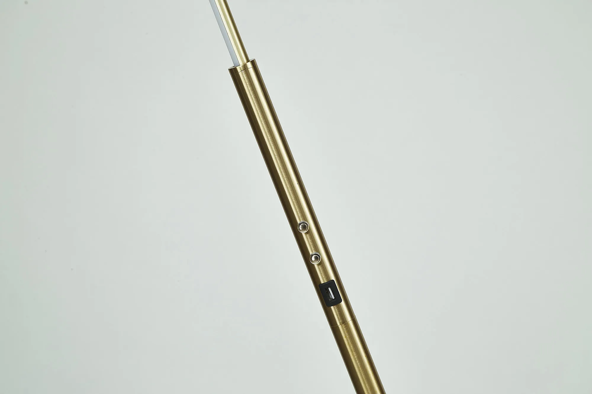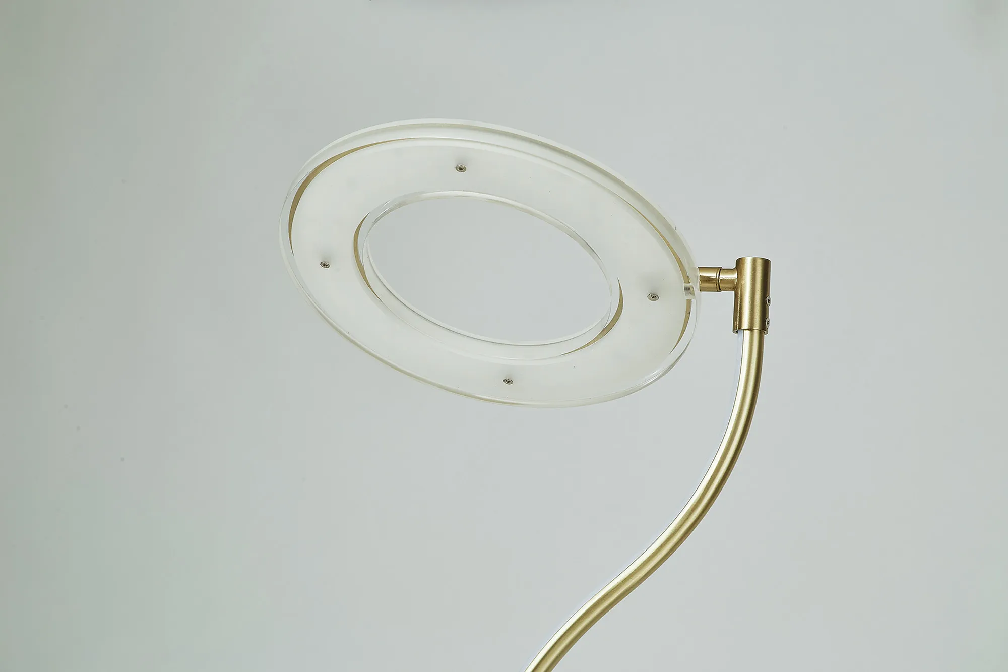 The Arcole floor lamp collection is a new modern, sleek design. Available in two colour finishes; satin gold and satin nickel, it compromises of a slim stem leading into a halo shaped housing of the integral LEDs. The LED head has the ability to pivot creating a uniqueness and exclusivity as well as heightened control of the lights directionality. To even further amplify the range's appeal, the floor lamp also includes a touch dimmer feature and USB charging ports.