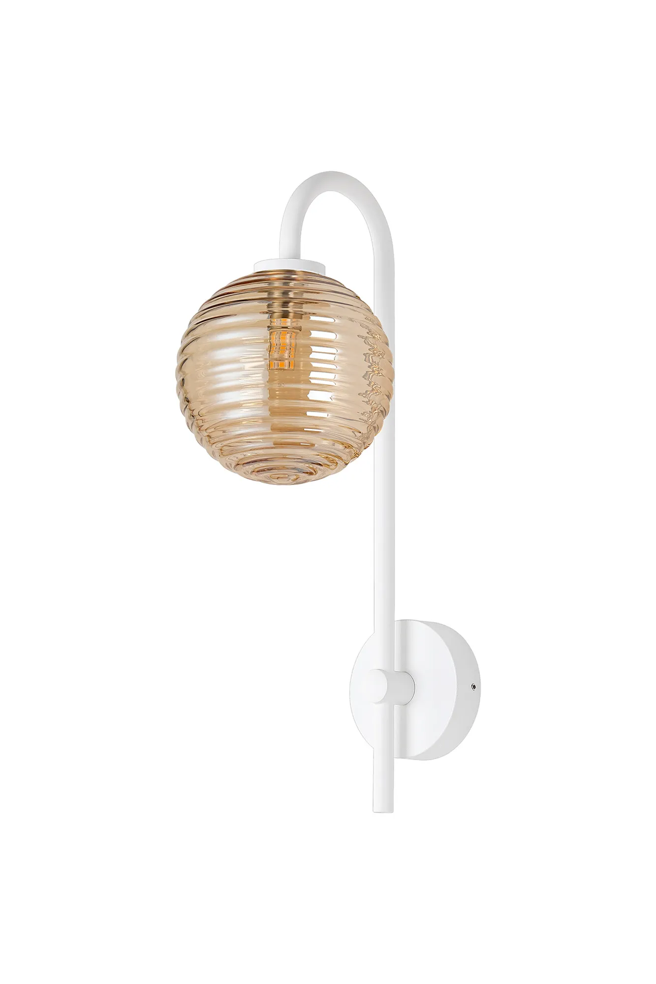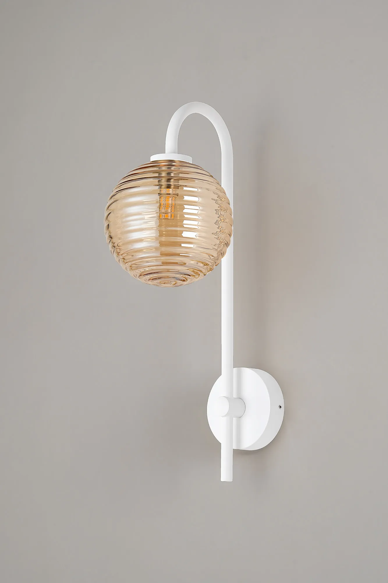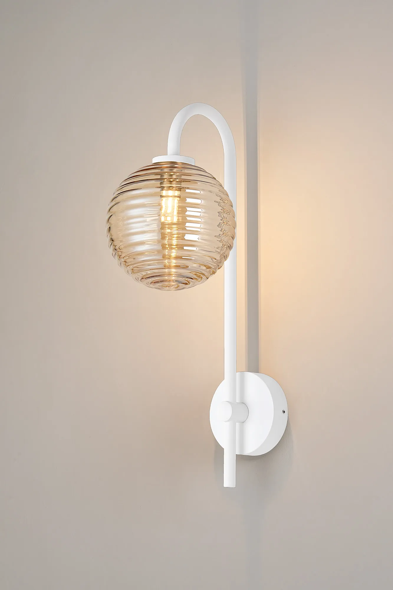 OTHER Casalserugo Curved Arm Wall Light, 1 Light G9, IP44, Satin White/Amber Ribbed Round Glass