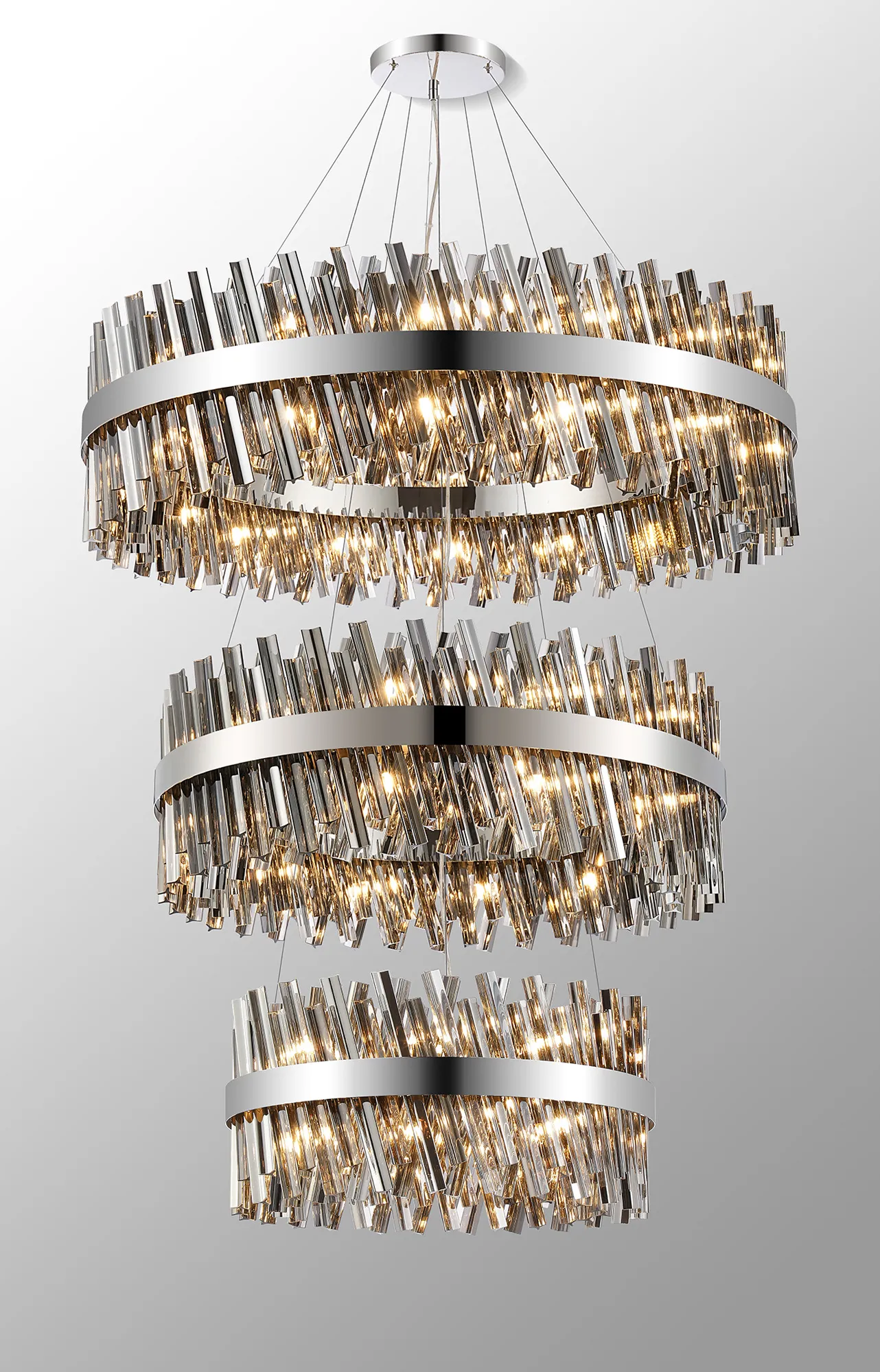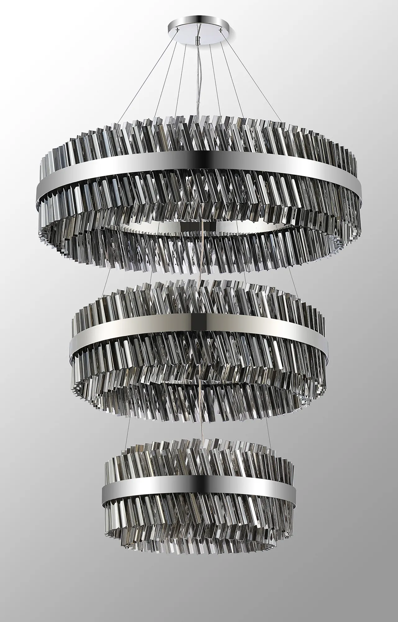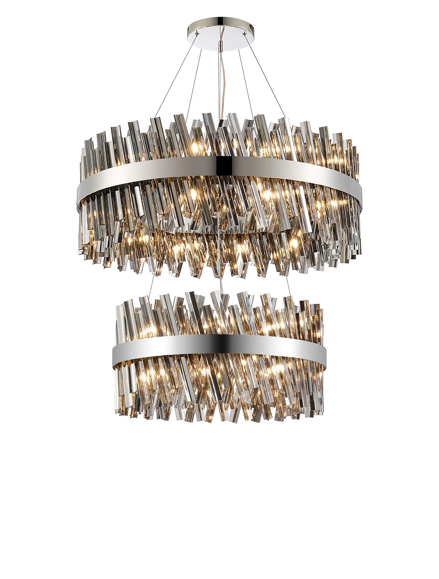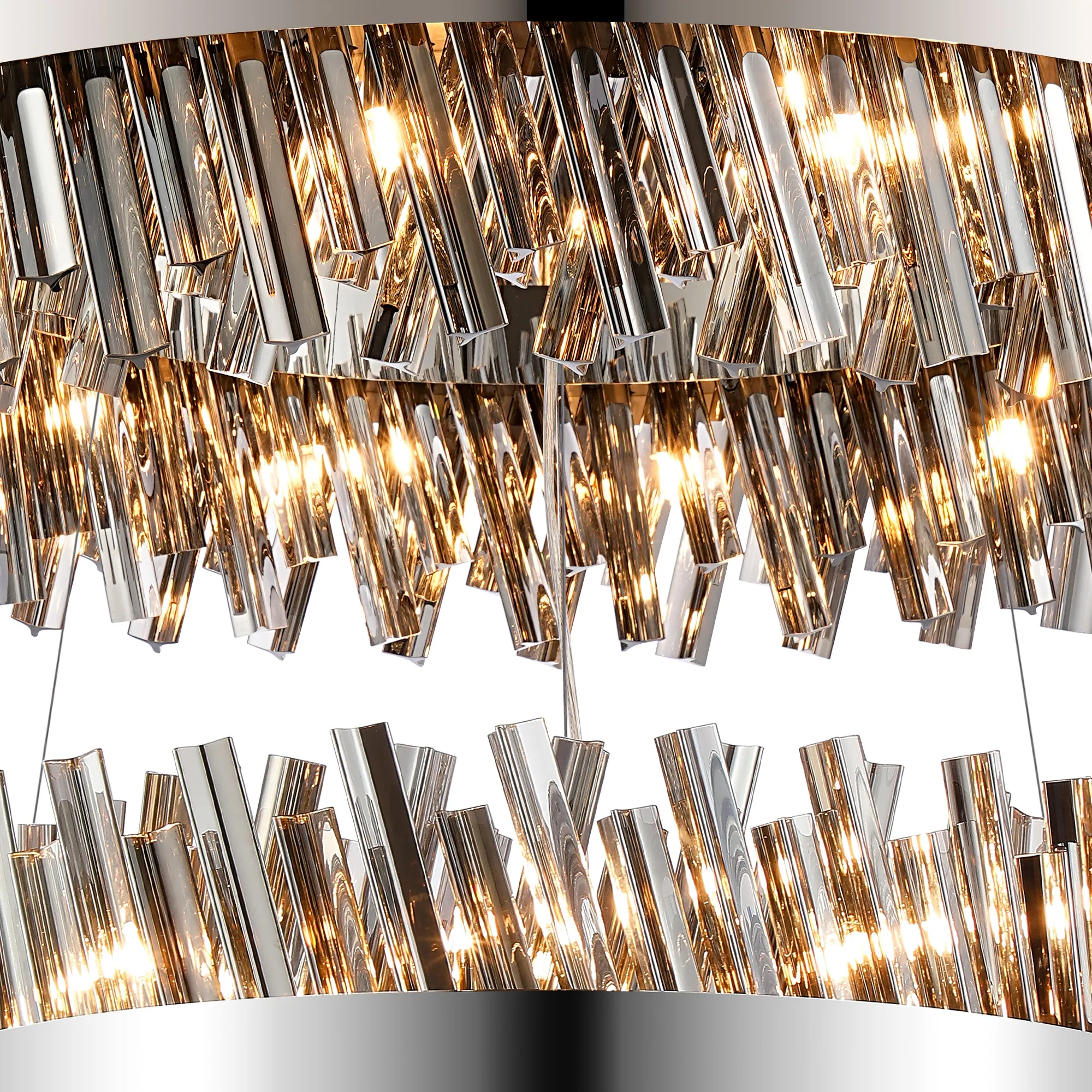 Fondo 5 Tier 25cm + 40cm + 60cm + 80cm + 1m Pendant, 6 + 10 + 18 + 24 + 32 Light G9, Polished Nickel/Smoke, Item Weight: 86kg