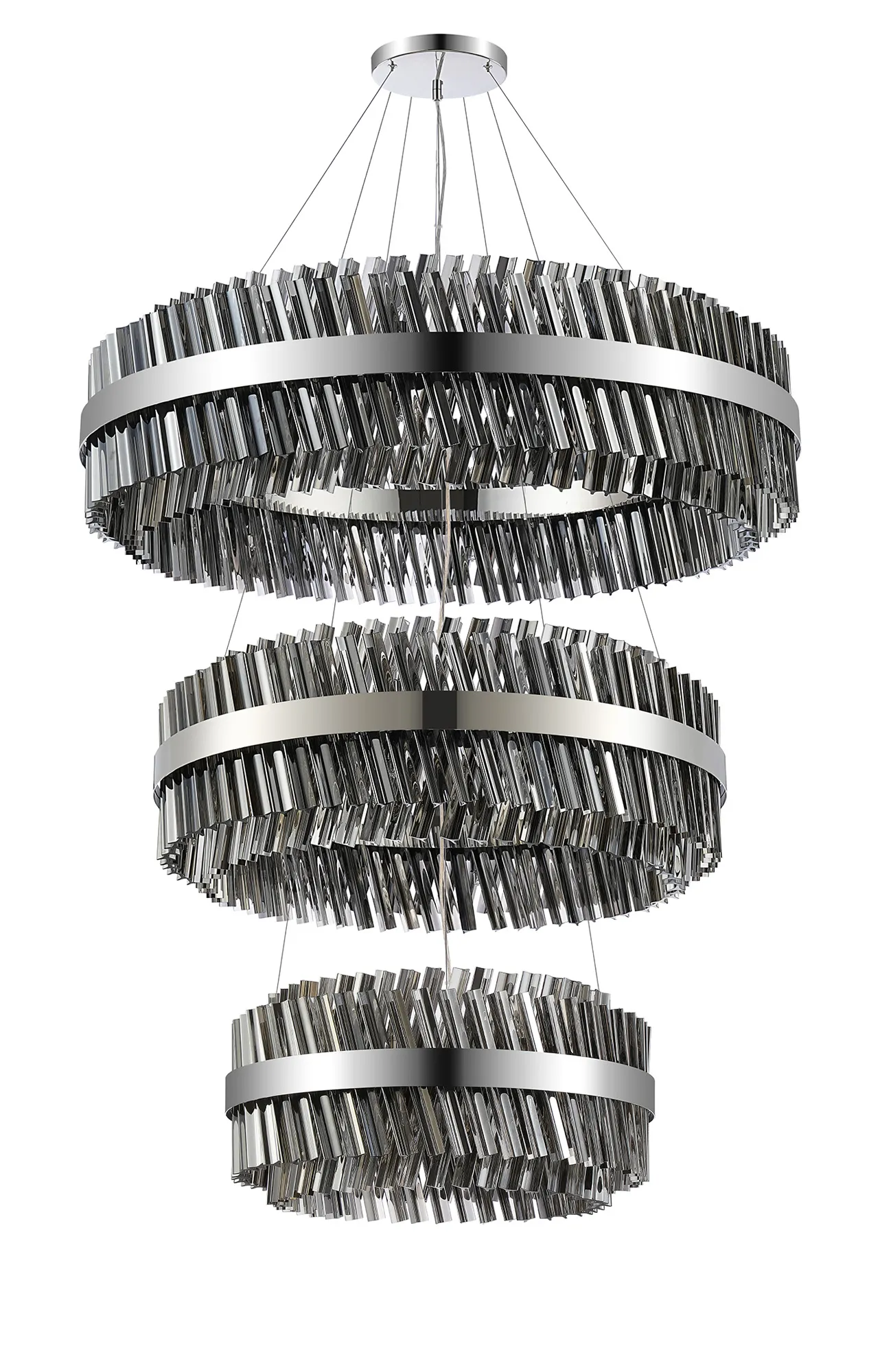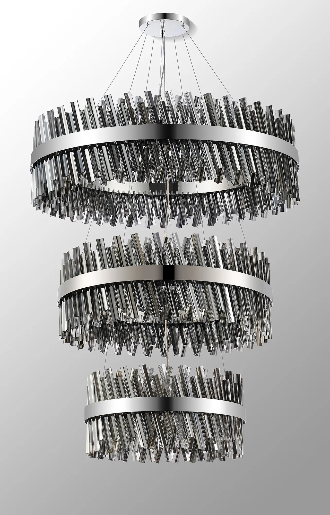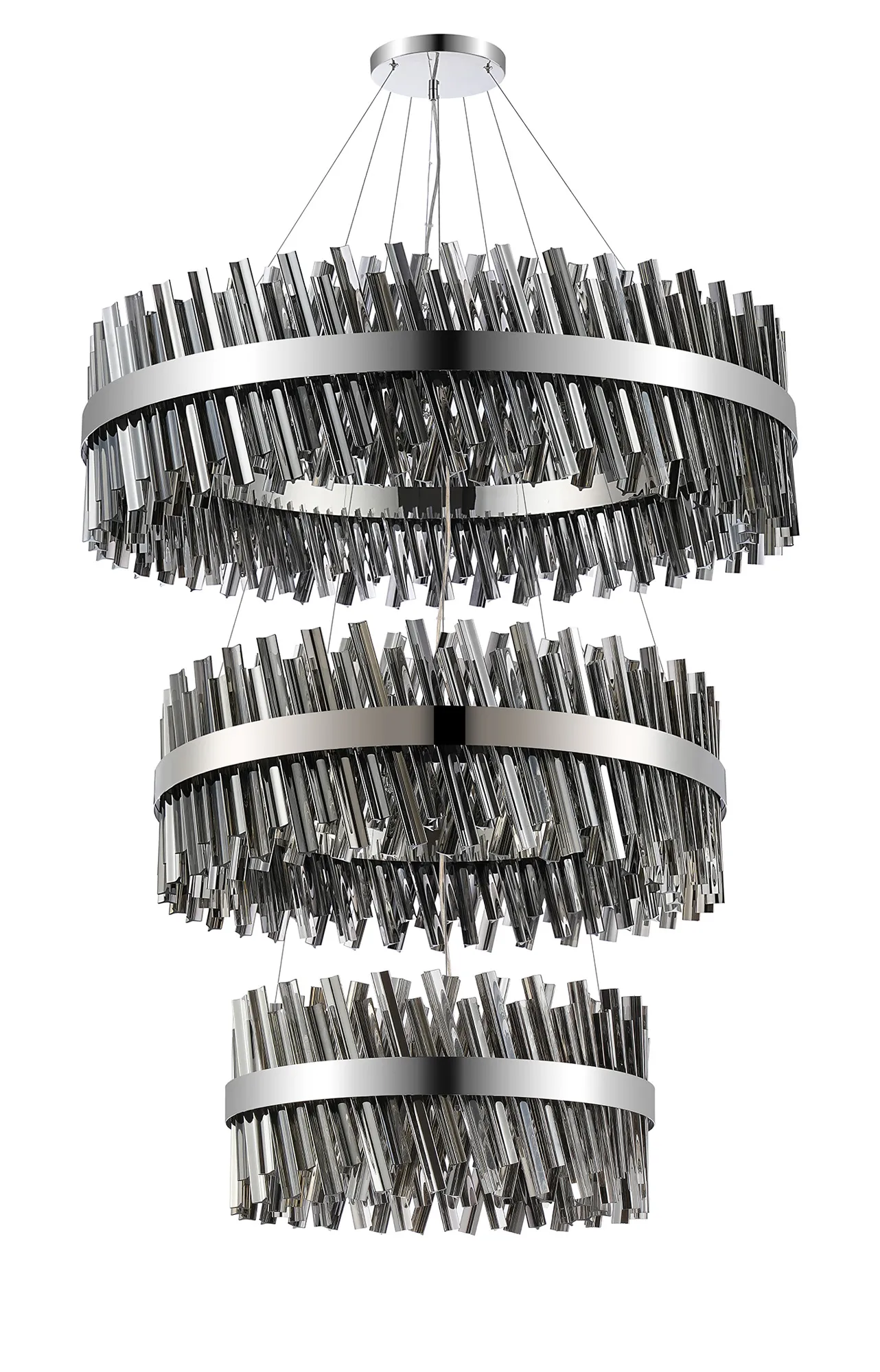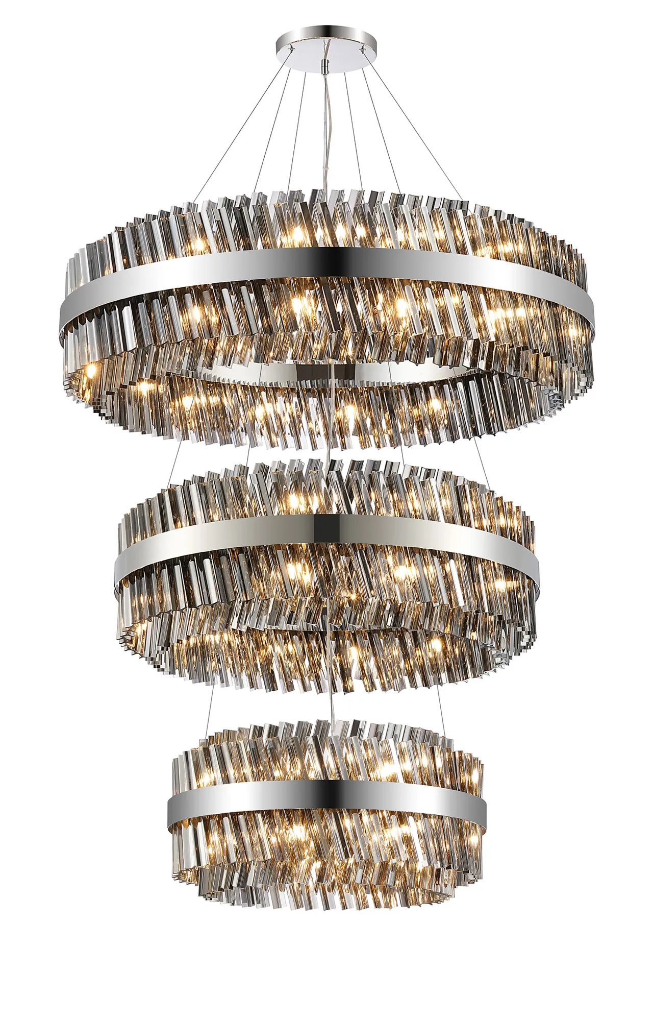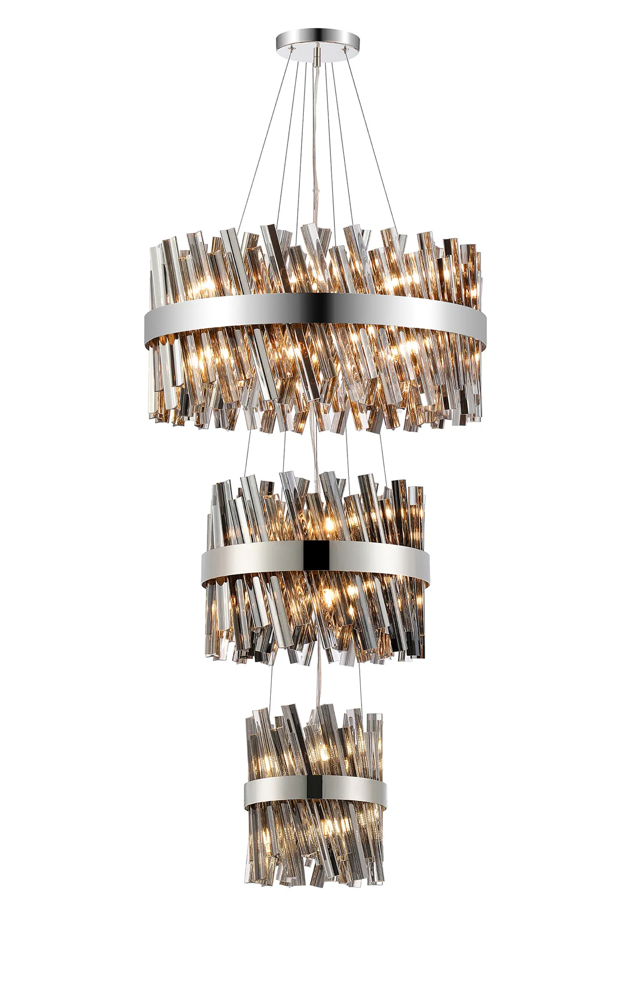 Fondo 5 Tier 25cm + 40cm + 60cm + 80cm + 1m Pendant, 6 + 10 + 18 + 24 + 32 Light G9, Polished Nickel/Smoke, Item Weight: 86kg