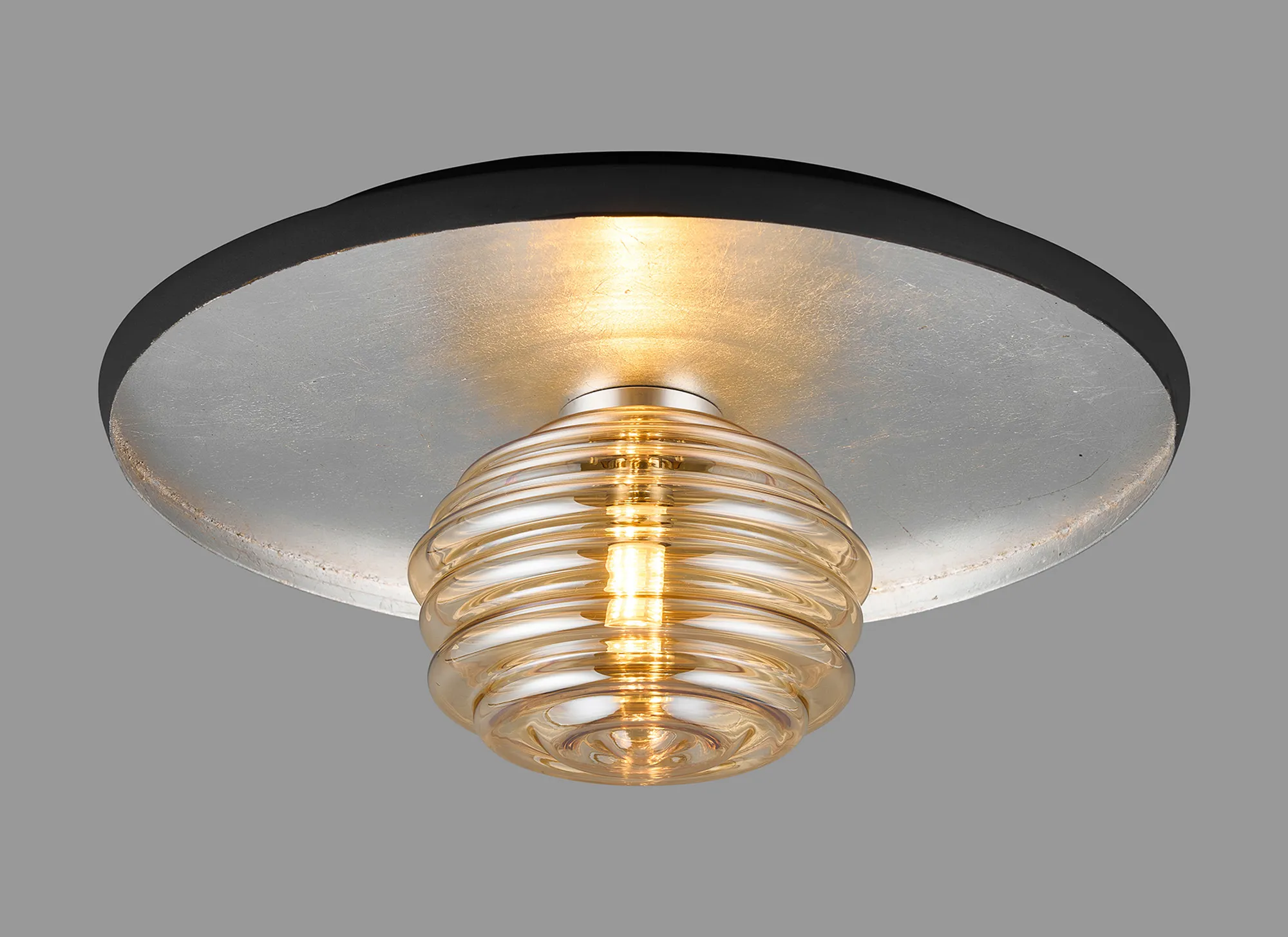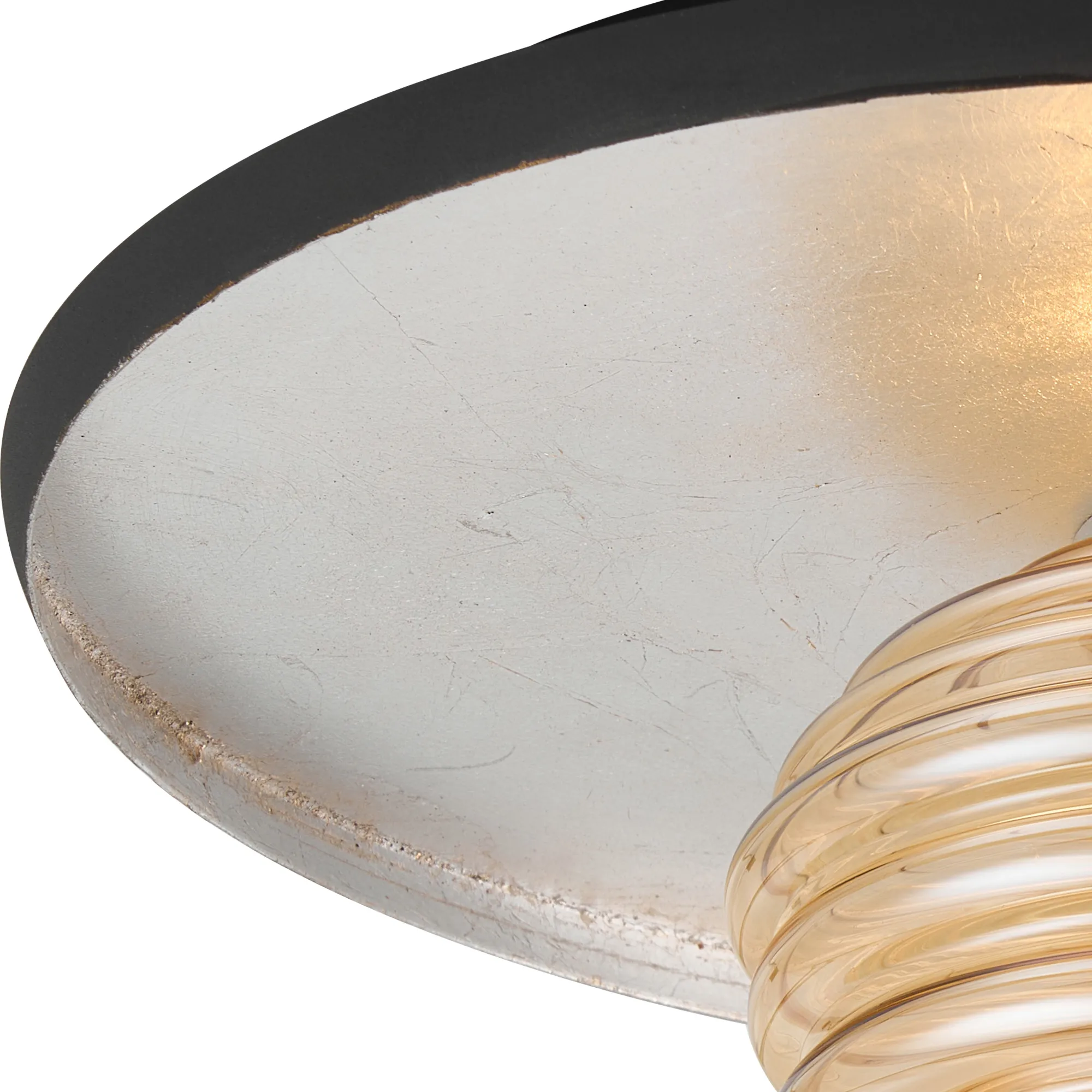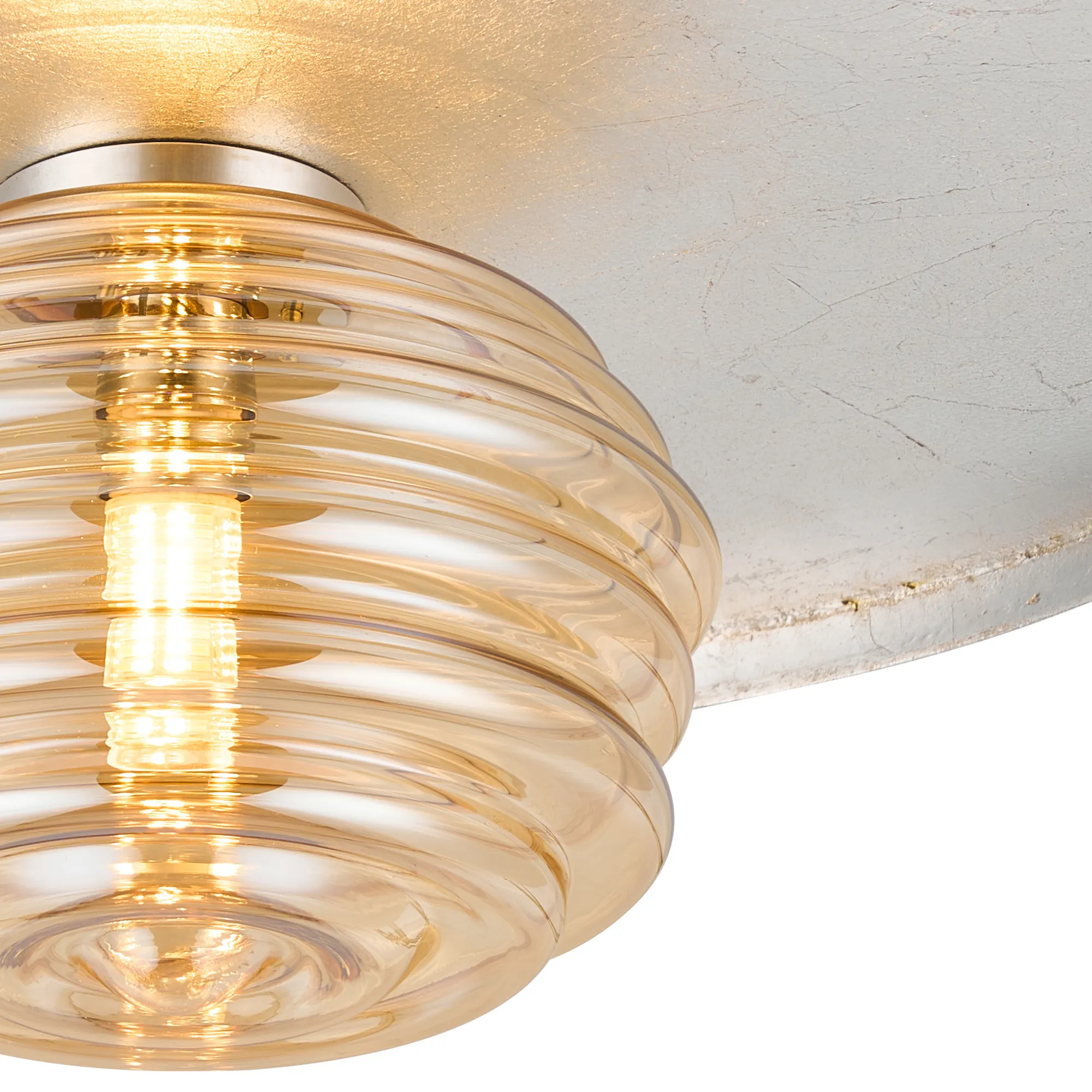 Erbezzo offers a stunningly classic, flush lighting solution. The single flush ceiling light acts a solo character piece. A vintage gold leaf or silver leaf finish is enhanced by the darker lipping encircling the frame. In keeping with the warm gold tones the outer colour is a coffee brown, where the silver is partnered with an anthracite finish. Choose your glass shade from a selection of 3 colours; smoke, amber, or clear with a mesmerizing rippled effect.