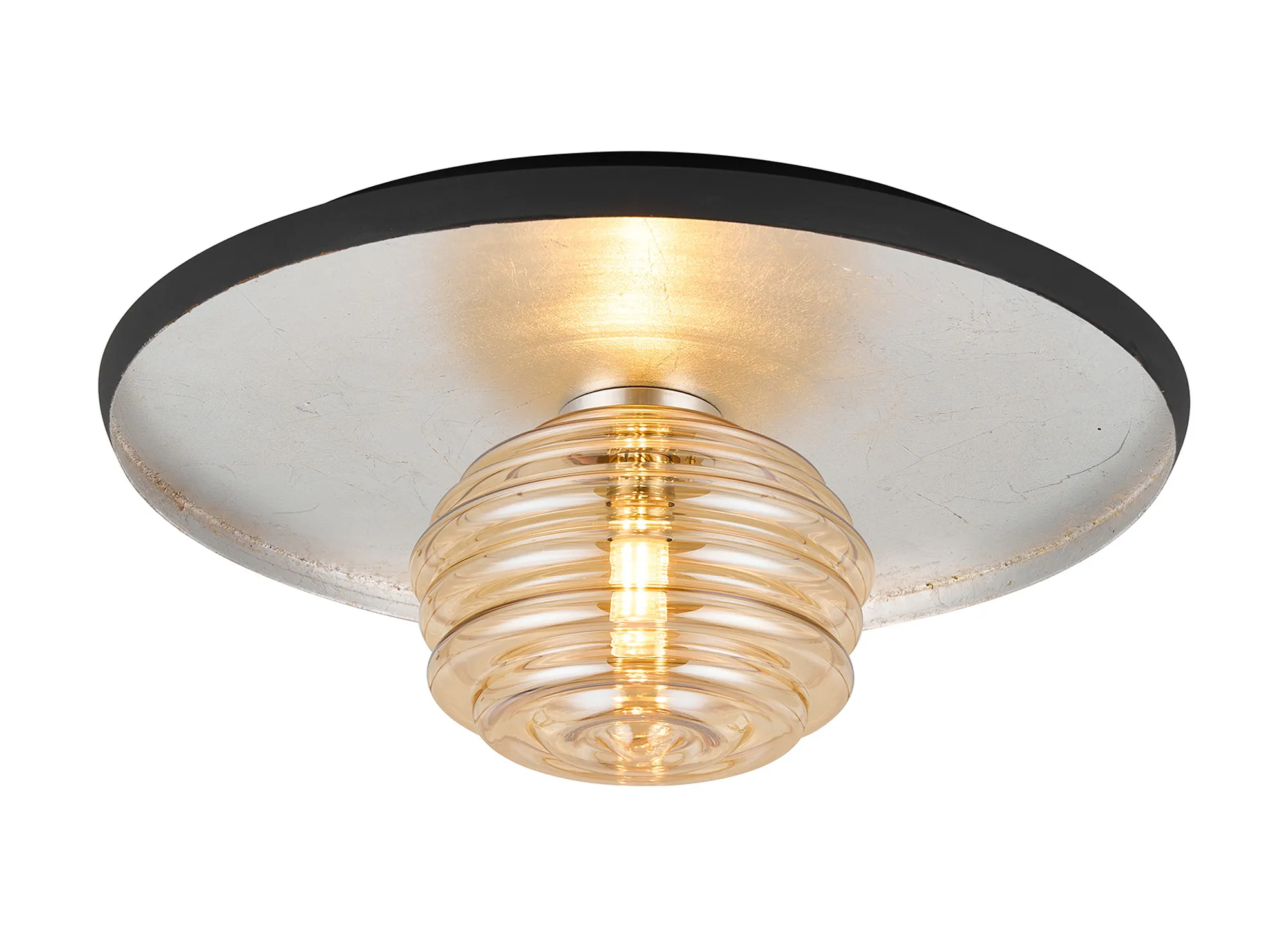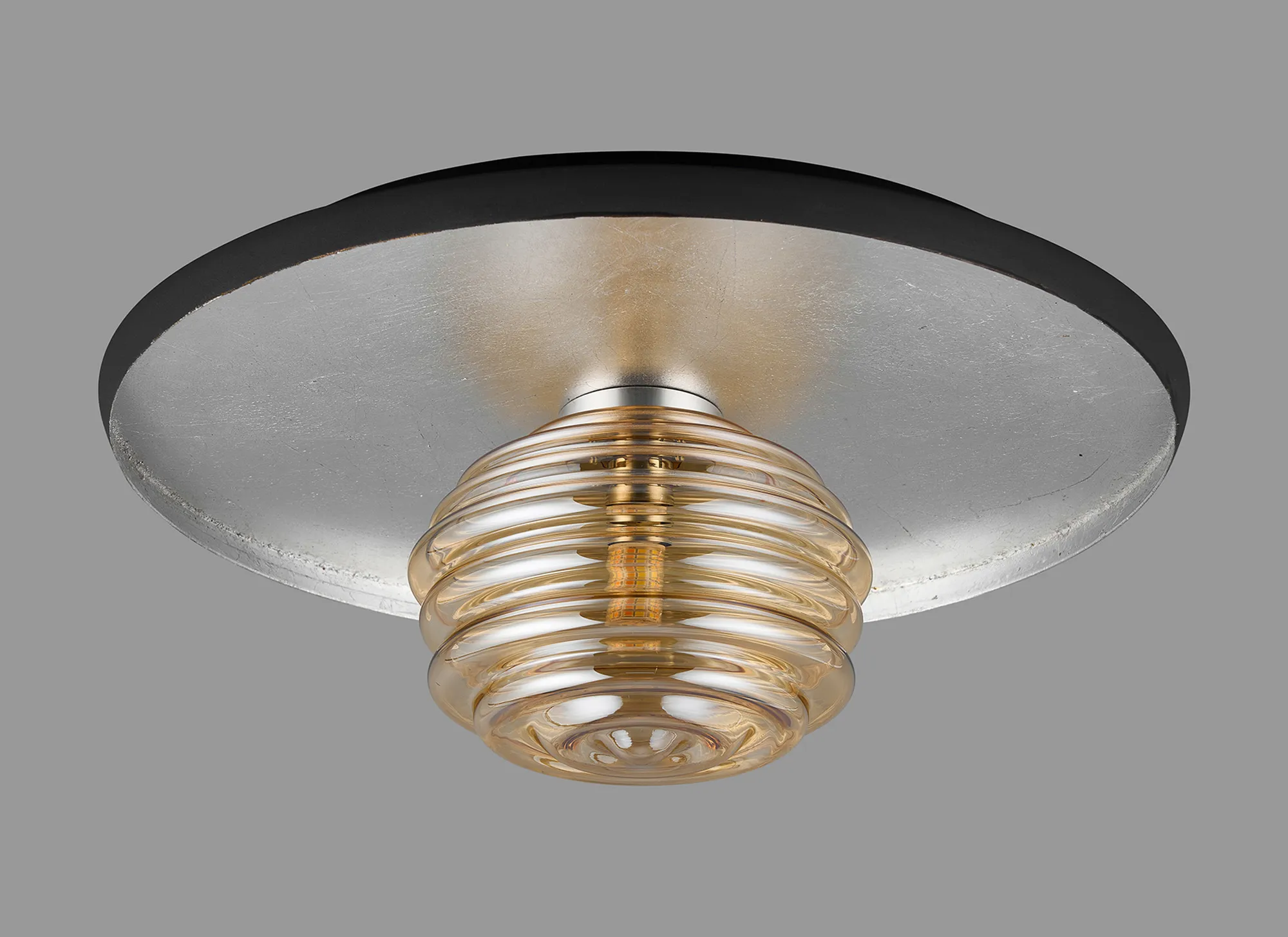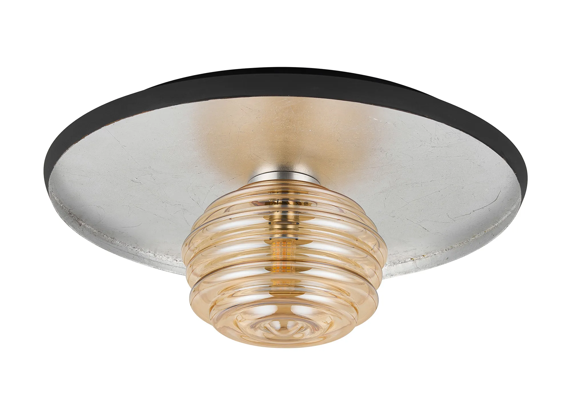 Erbezzo offers a stunningly classic, flush lighting solution. The single flush ceiling light acts a solo character piece. A vintage gold leaf or silver leaf finish is enhanced by the darker lipping encircling the frame. In keeping with the warm gold tones the outer colour is a coffee brown, where the silver is partnered with an anthracite finish. Choose your glass shade from a selection of 3 colours; smoke, amber, or clear with a mesmerizing rippled effect.