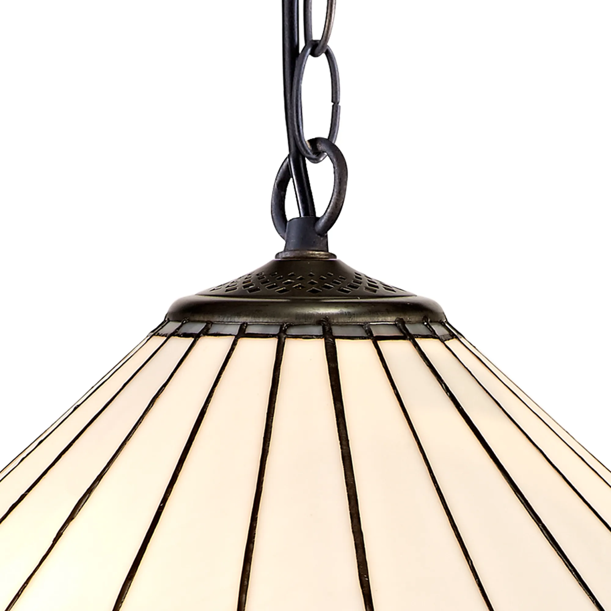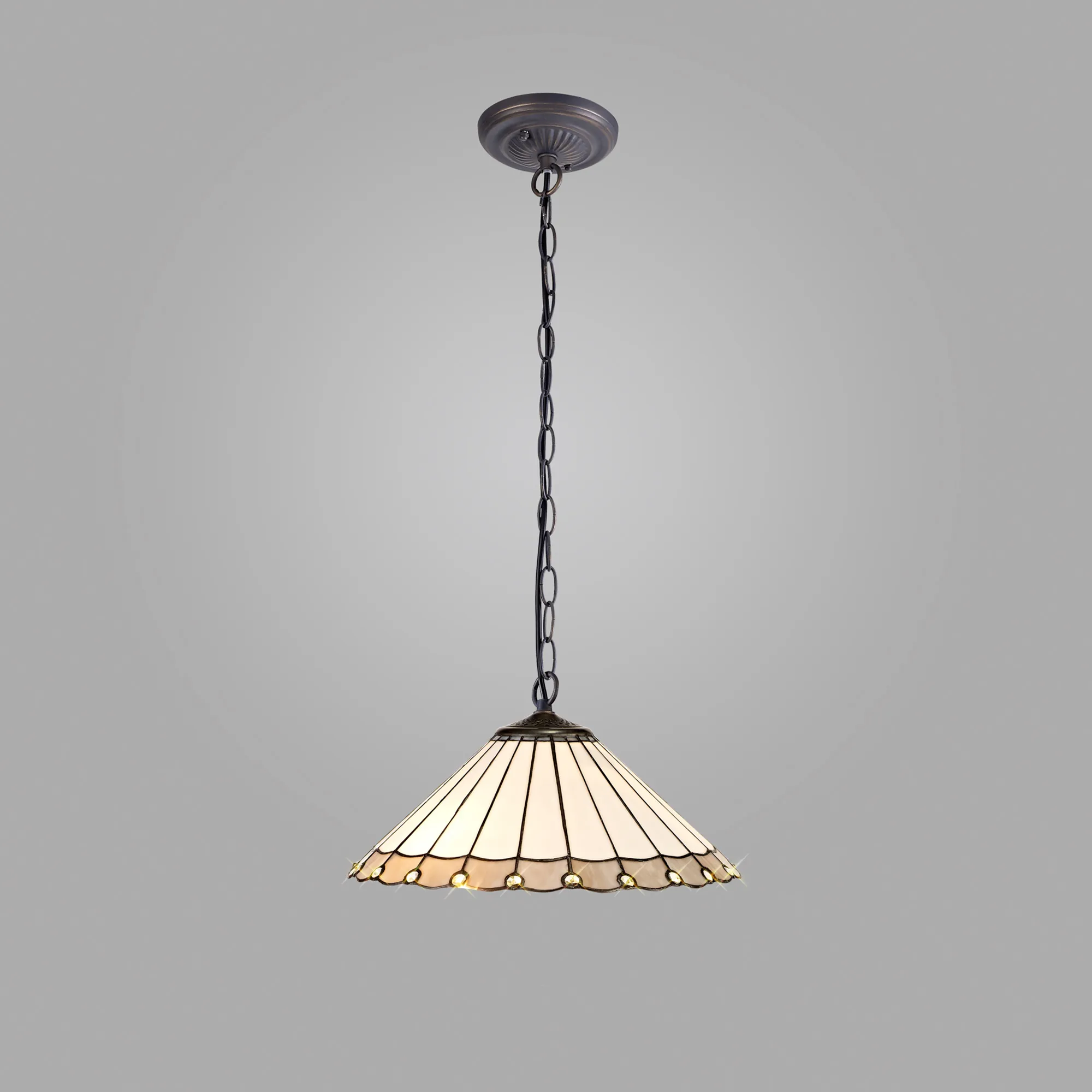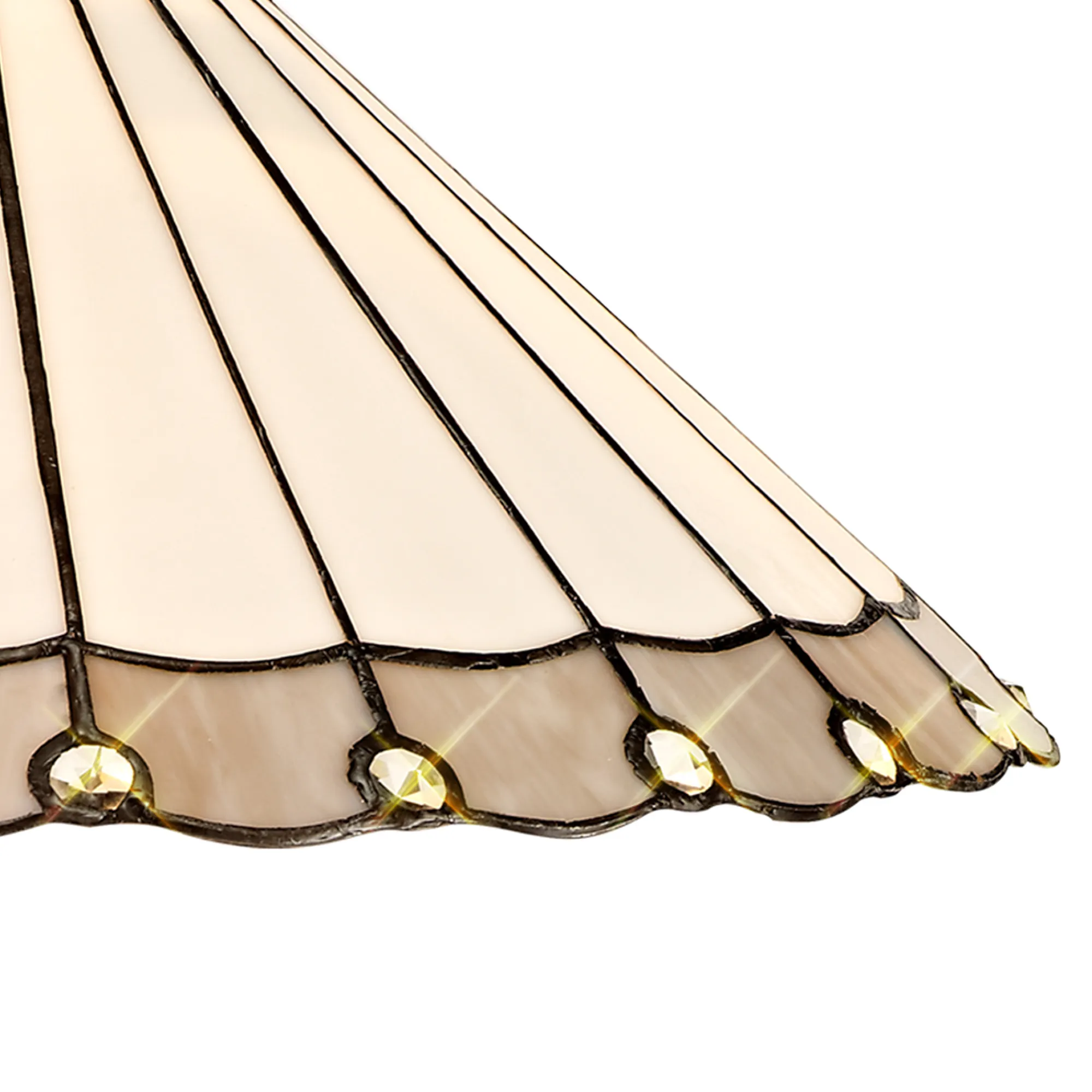Tedera uses a traditional Tiffany shade but with a modern twist. The fanned feather shapes forming the umbrella glass is mostly cream coloured with the curved tips of each point available in either green, brown, red, blue or grey. The modern component takes the form of small clear crystal pieces fixed on alternating points of the shades rim furthering the ranges regal appeal. The range of colours gives this products such a large range of settings with the table lamps, floor lamps, pendants and semi ceiling pendants