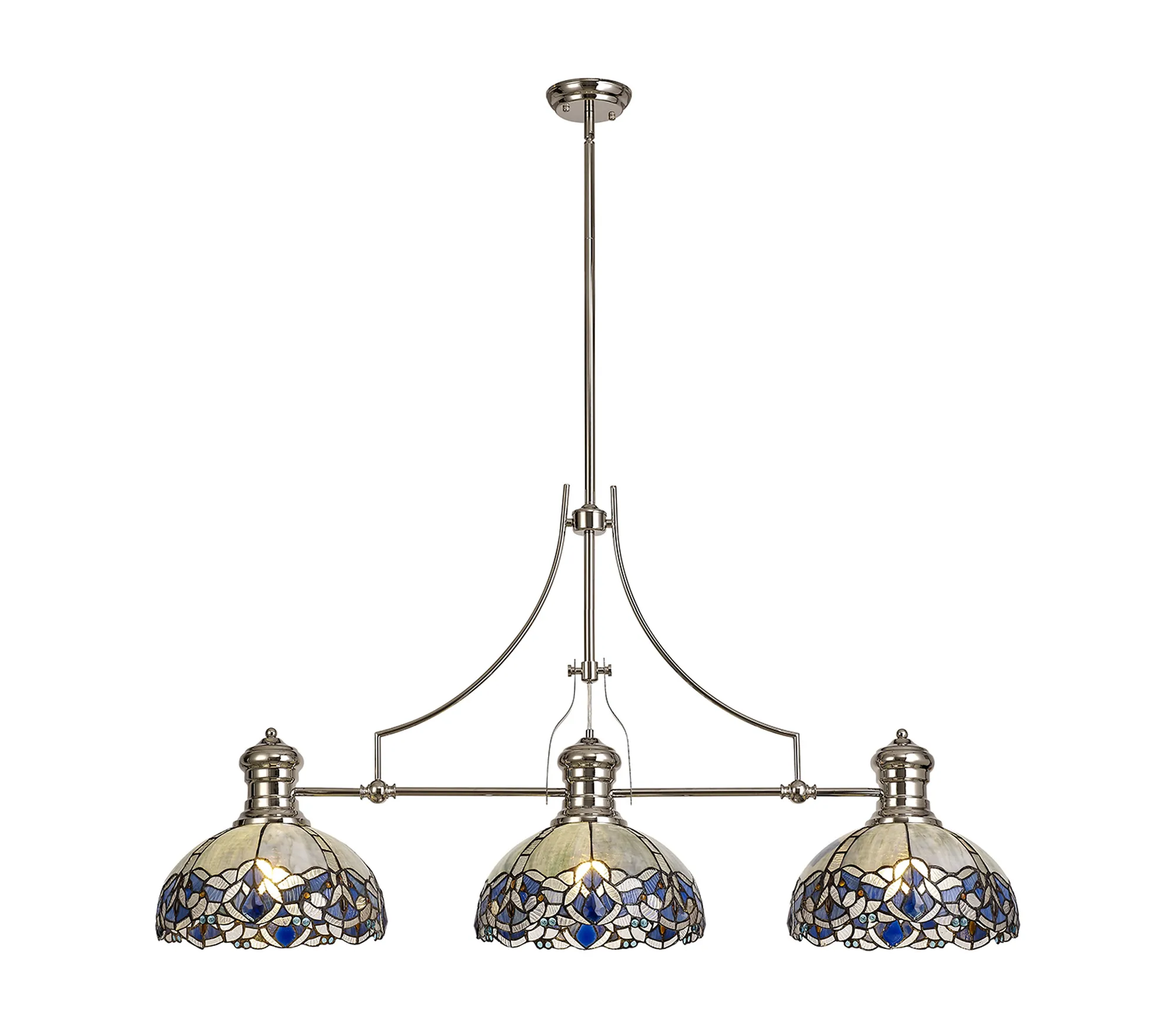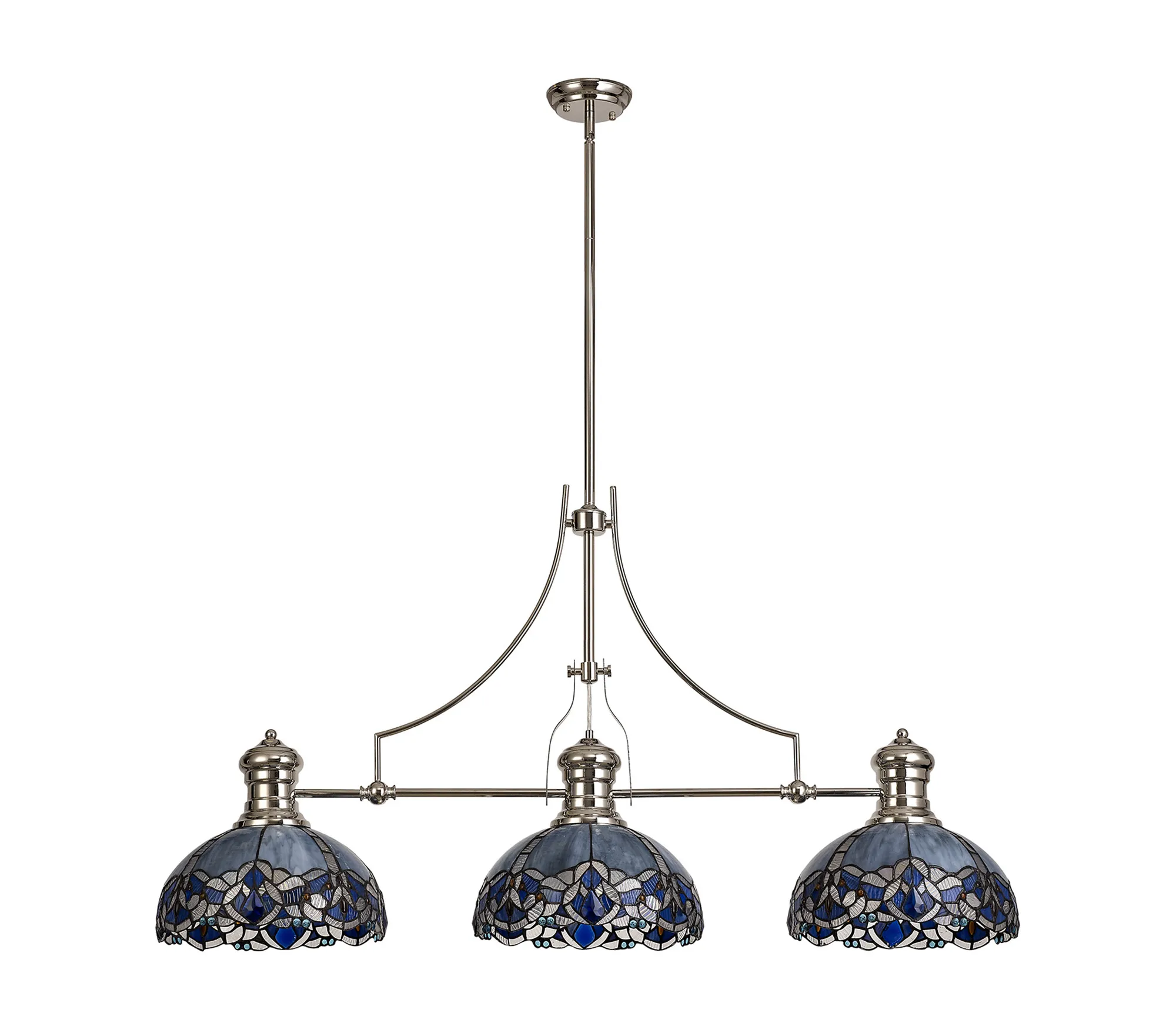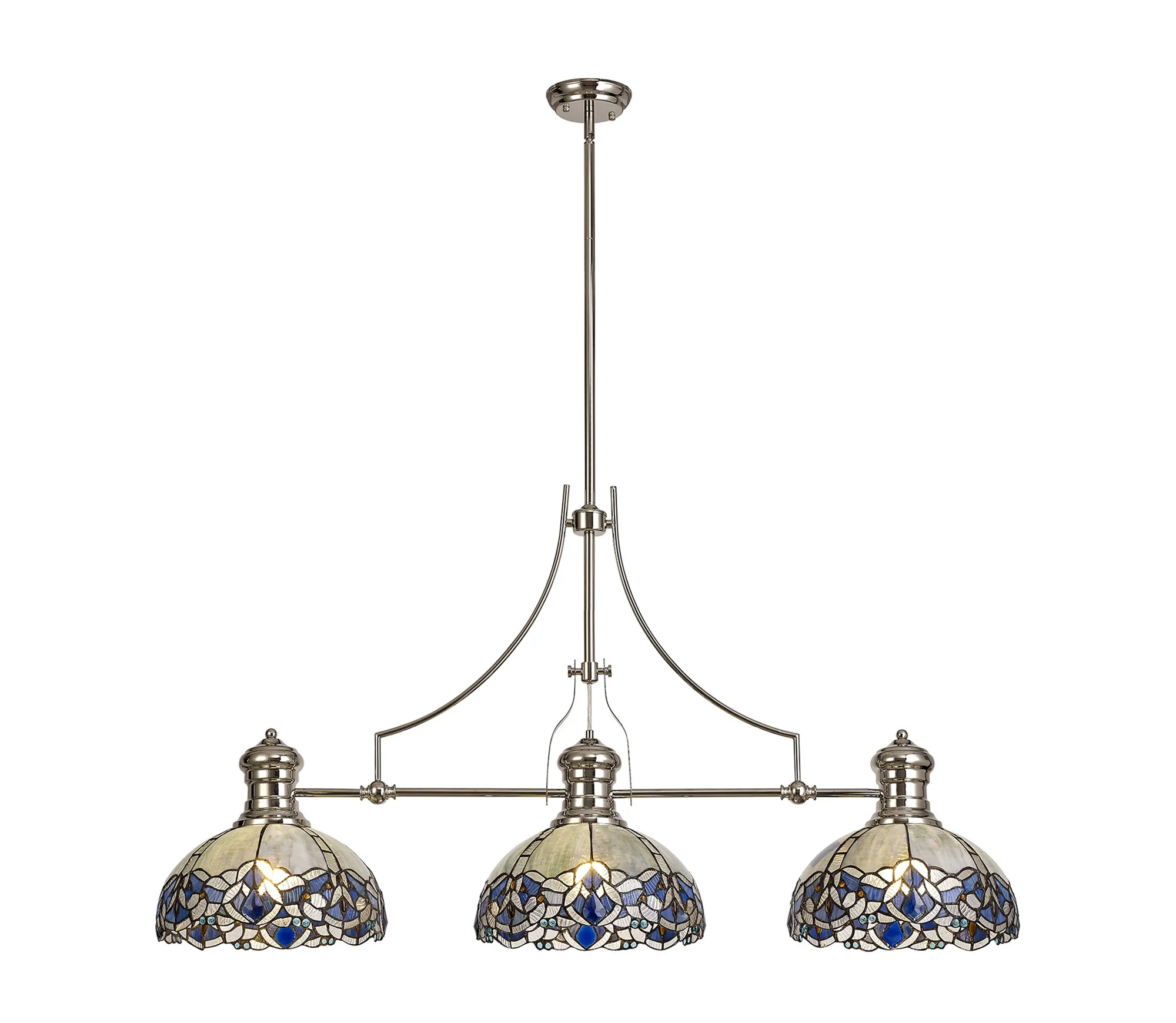 Podenzana 3 Light Linear Pendant E27 With 30cm Tiffany Shade, Antique Brass, Blue, Clear Crystal