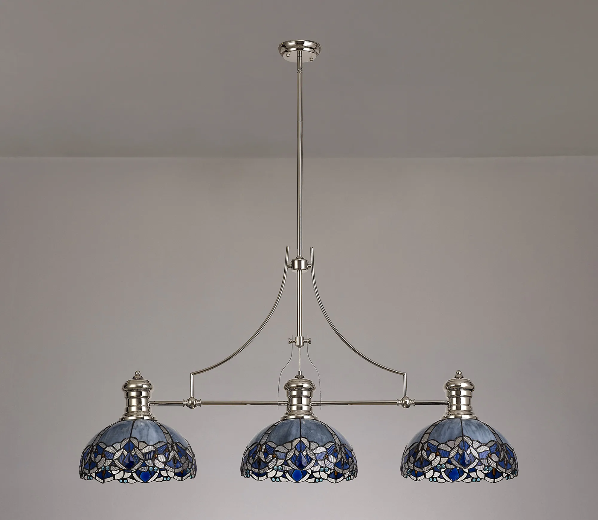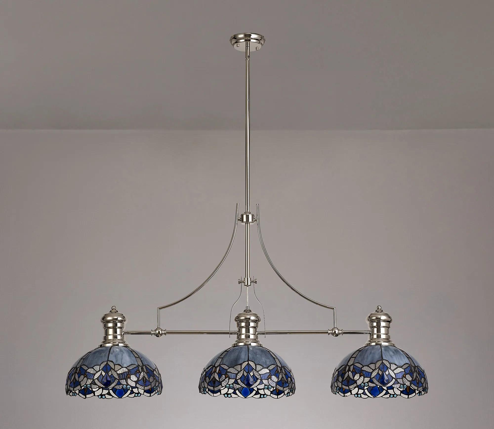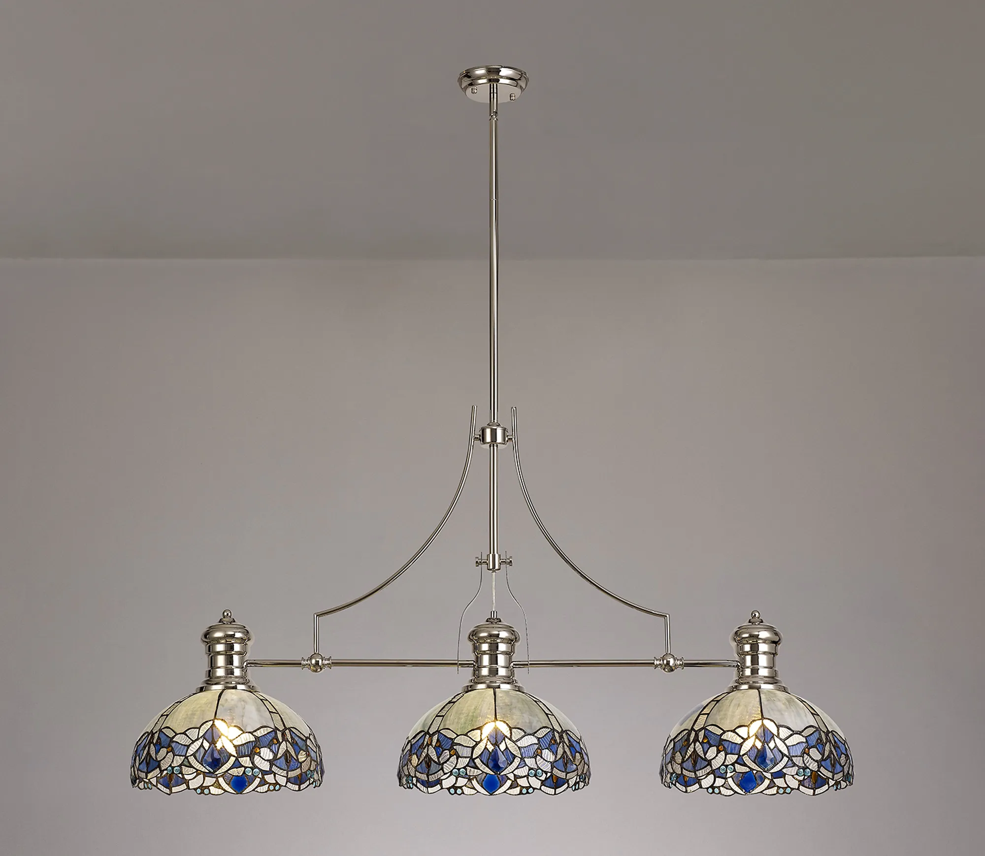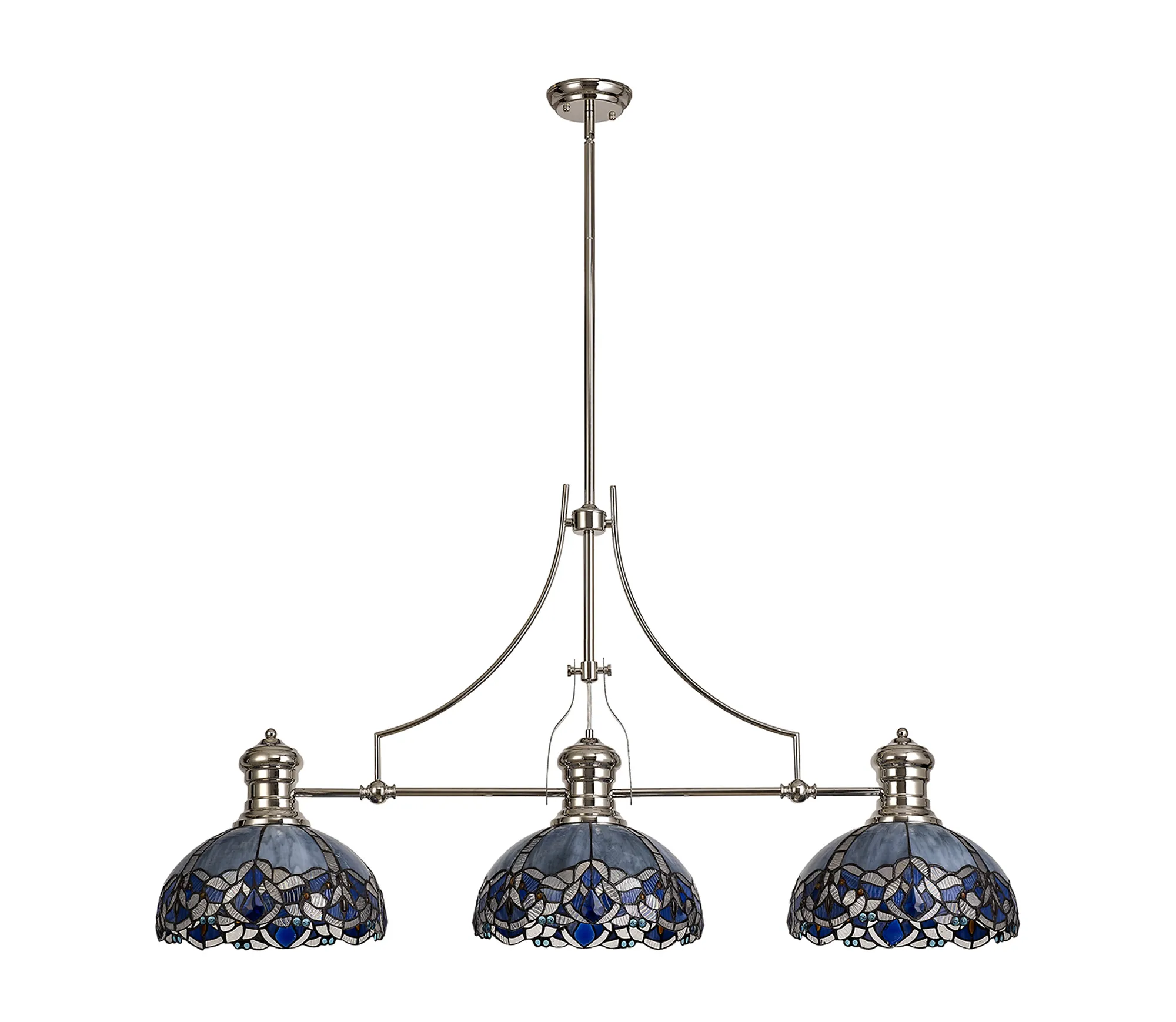 Podenzana 3 Light Linear Pendant E27 With 30cm Tiffany Shade, Antique Brass, Blue, Clear Crystal