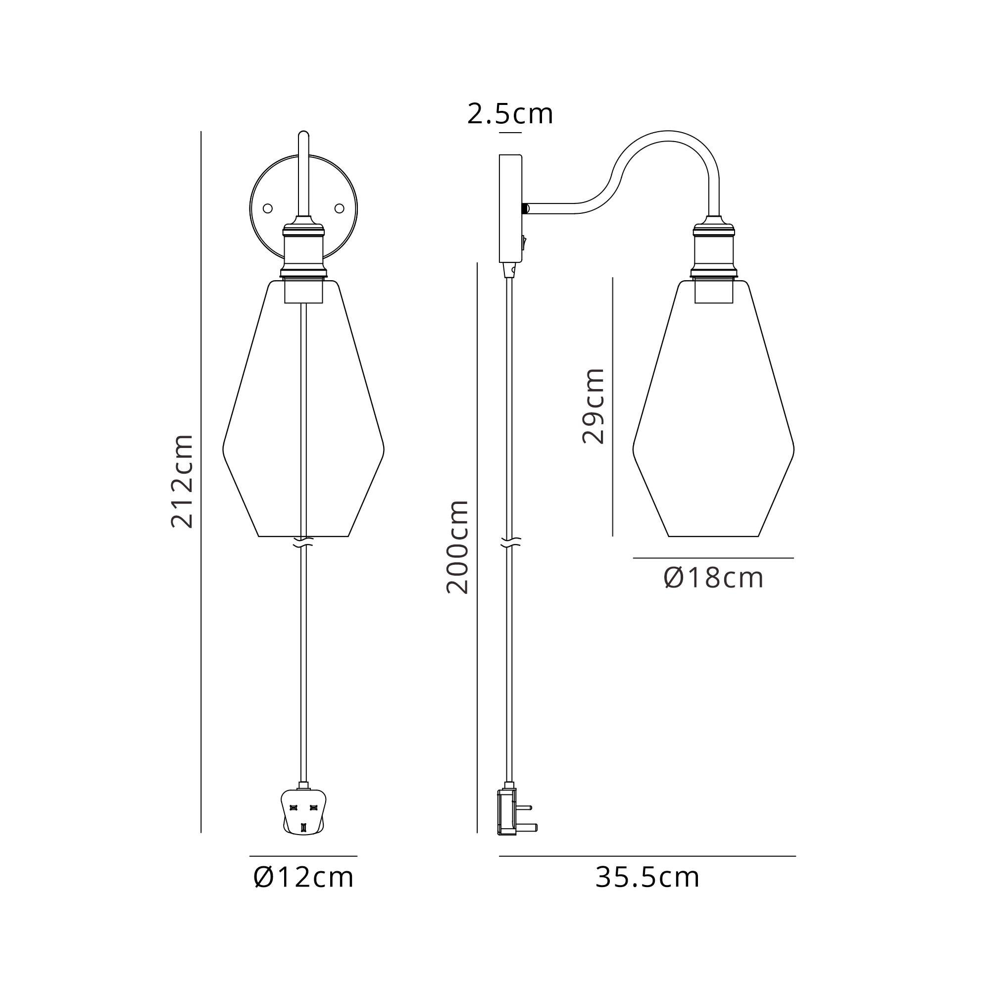 Rotzo Switched Curve Wall Light With Plug, 1 Light E27, Black/Iridescent Open Mouth Globe Glass Shade