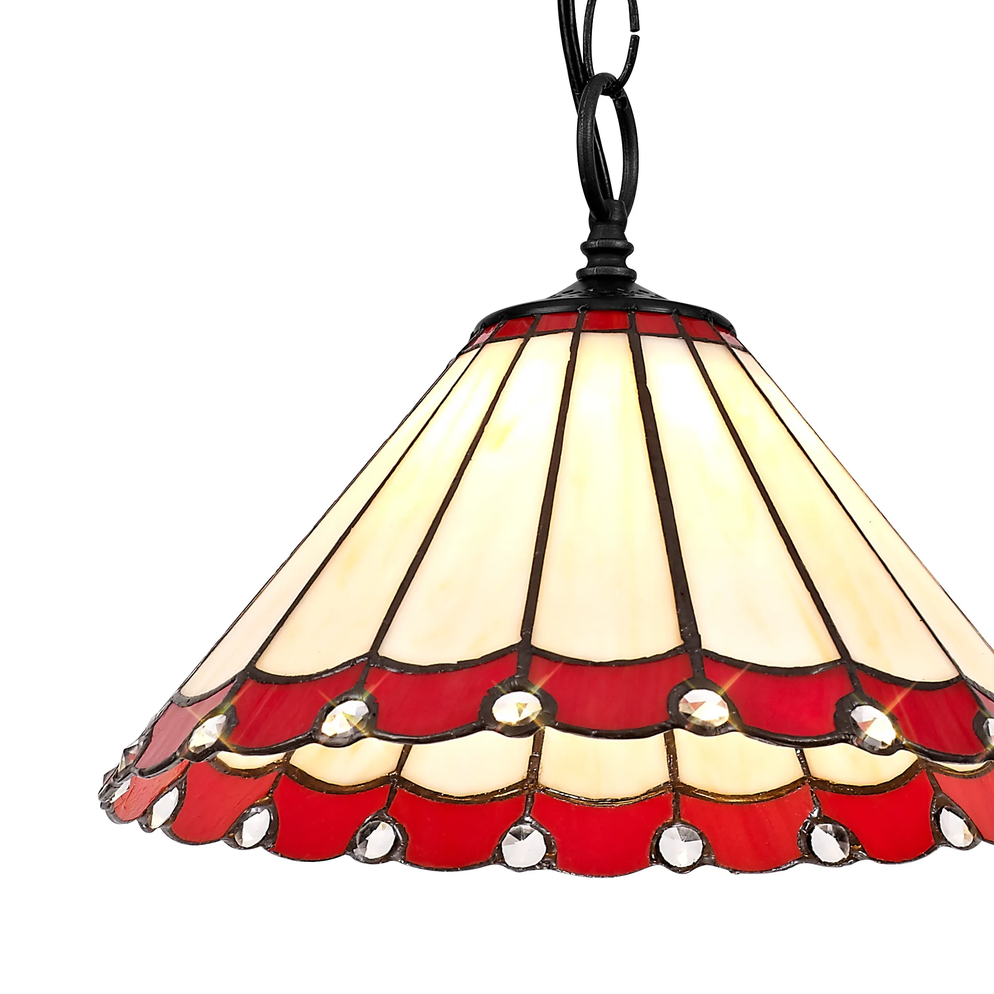 Tedera 3 Light Linear Pendant E27 With 30cm Tiffany Shade, Antique Brass, Red, Cream, Crystal