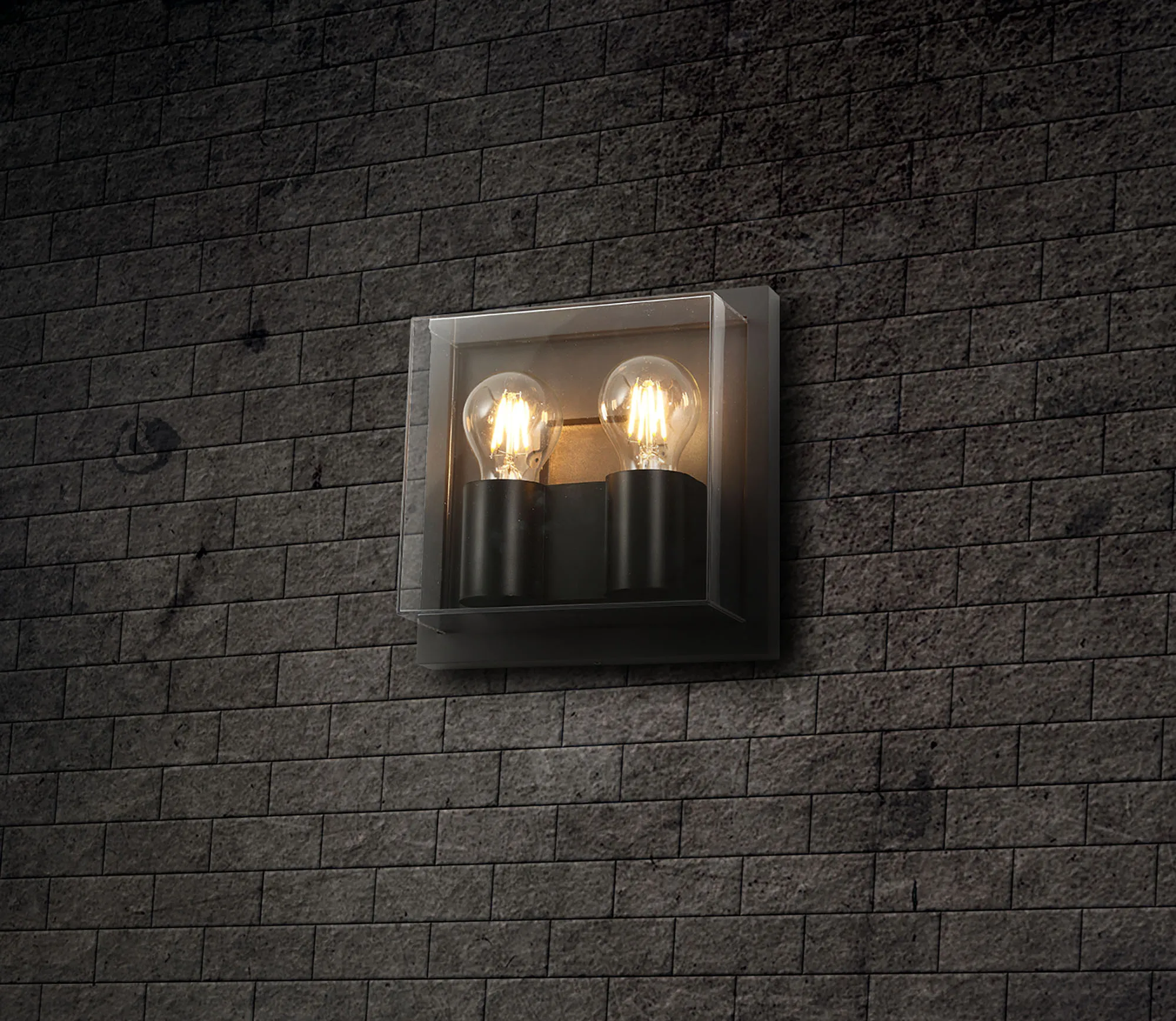 Abbadia offers an inventive wall light design, the square form of the frame hosts a 3D clear casing reflective of a traditional museum display case. Both wall lamps are IP65 rated making them suitable for outdoor use, while one design holds the integral LEDs within an acrylic diffuser the other enables more flexibility with two E27 lamp holders giving you control over the shape, wattage and colour temperature of the lamp used.