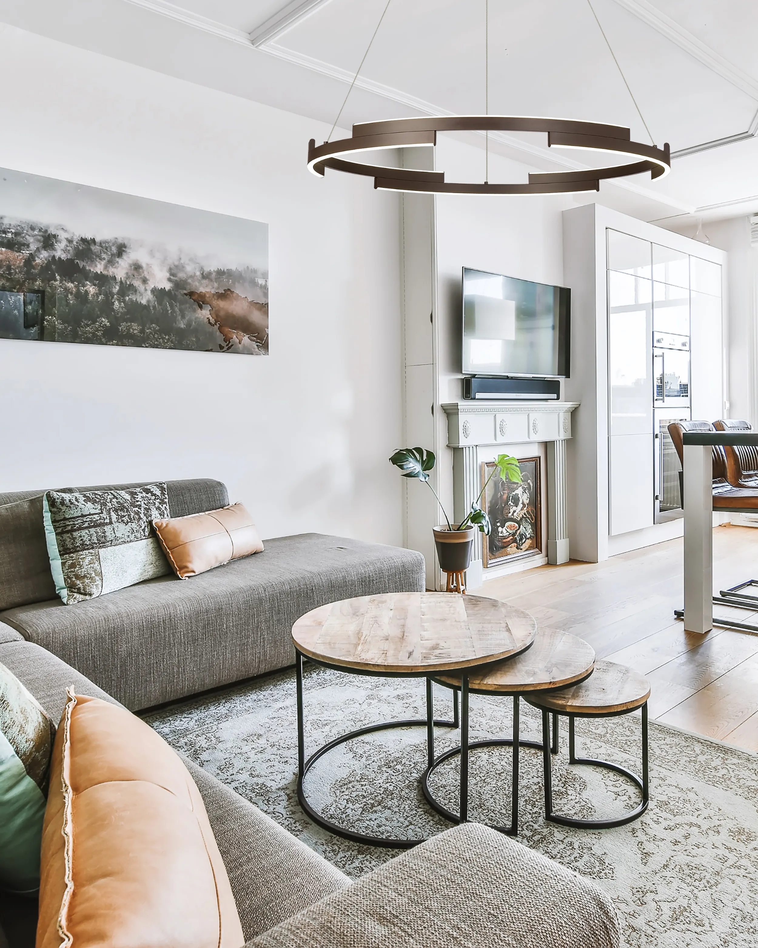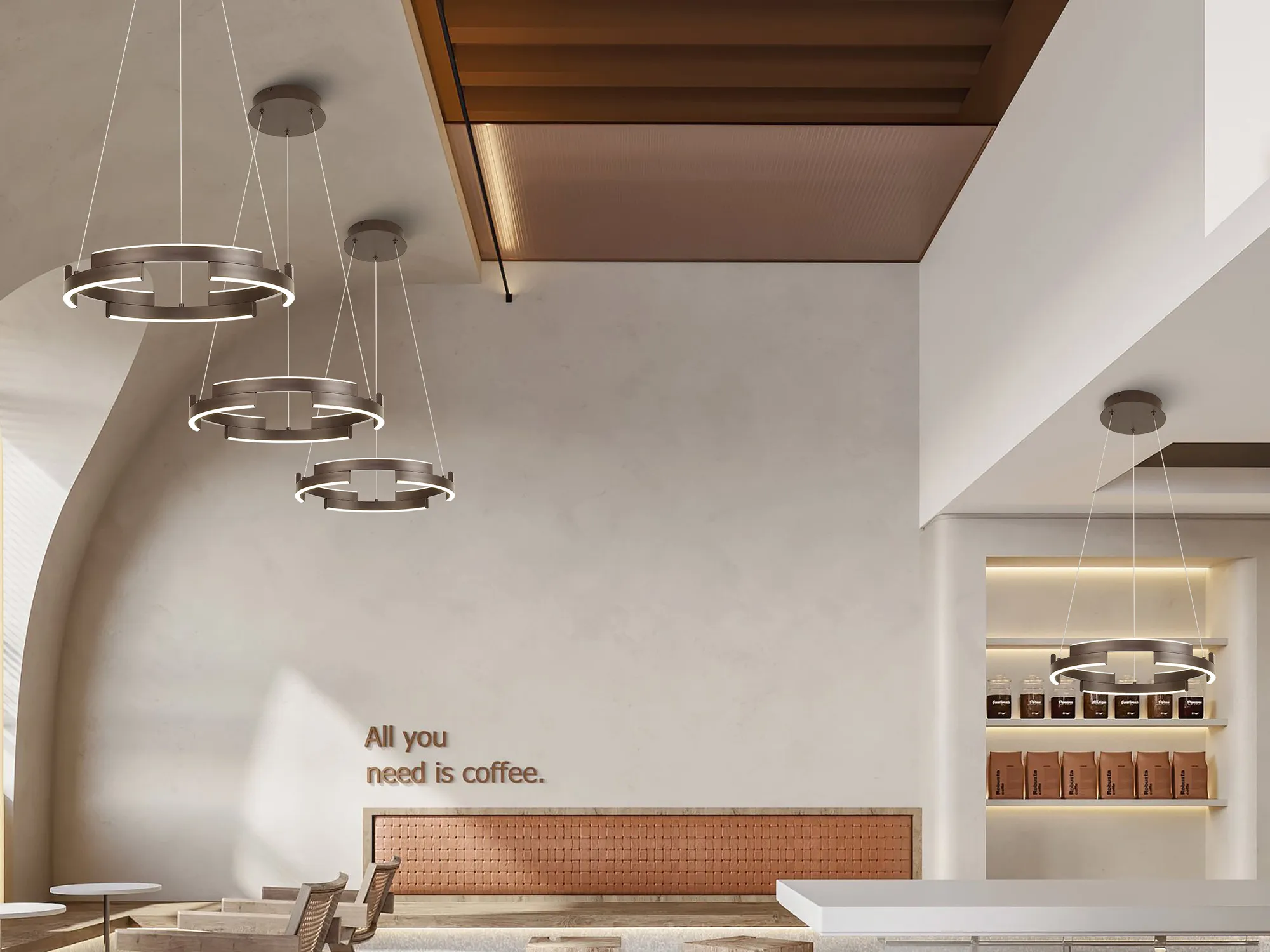 Available in three round sizes and impactful 1.2m linear, the Affi collection provides an intriguing visual. With a 3-step dimming feature each LED pendant light has a deconstructed hollow ring shape creating extra dimension as well as an eye-catching aesthetic. Affi is available in either a brown oxide or sand gold colour finish.