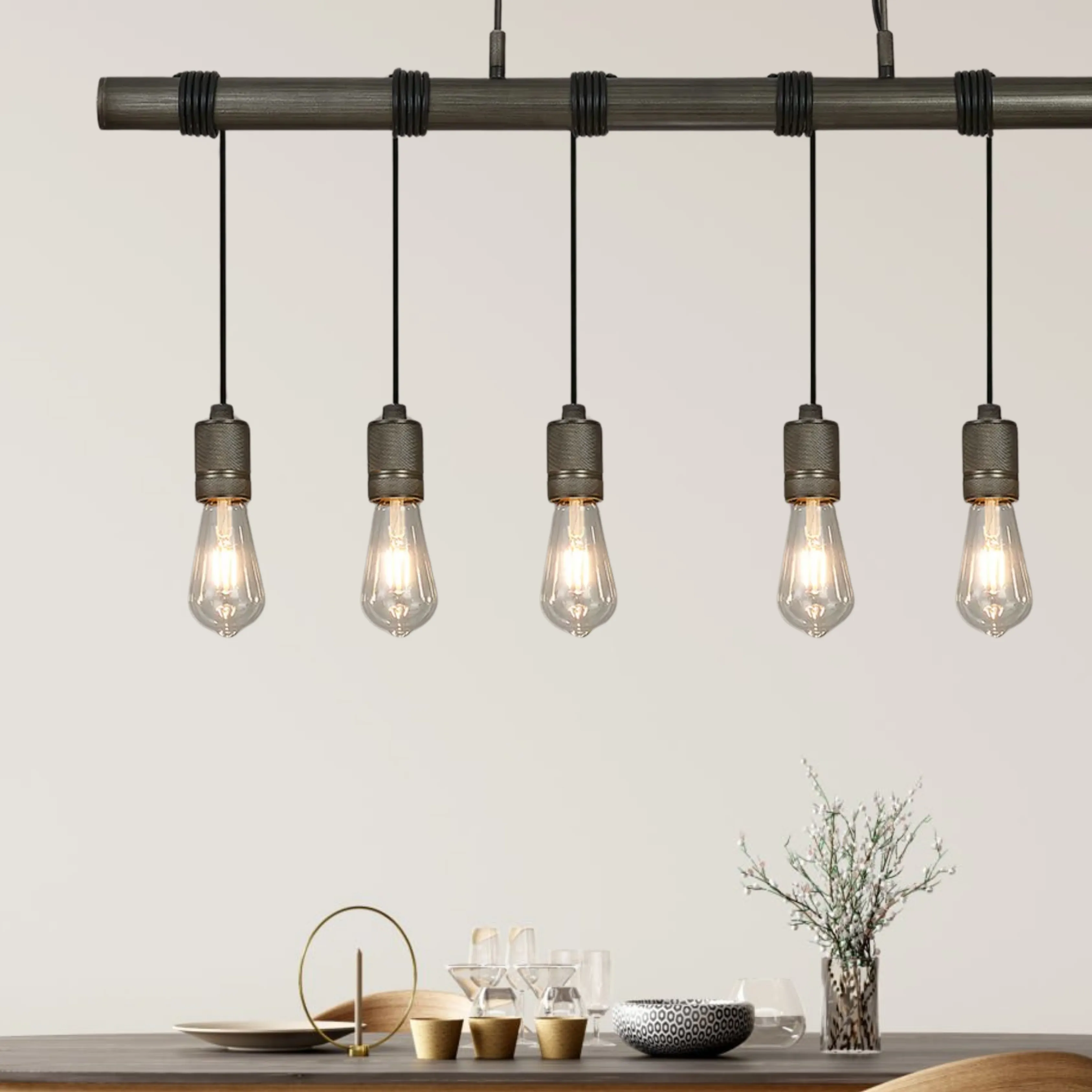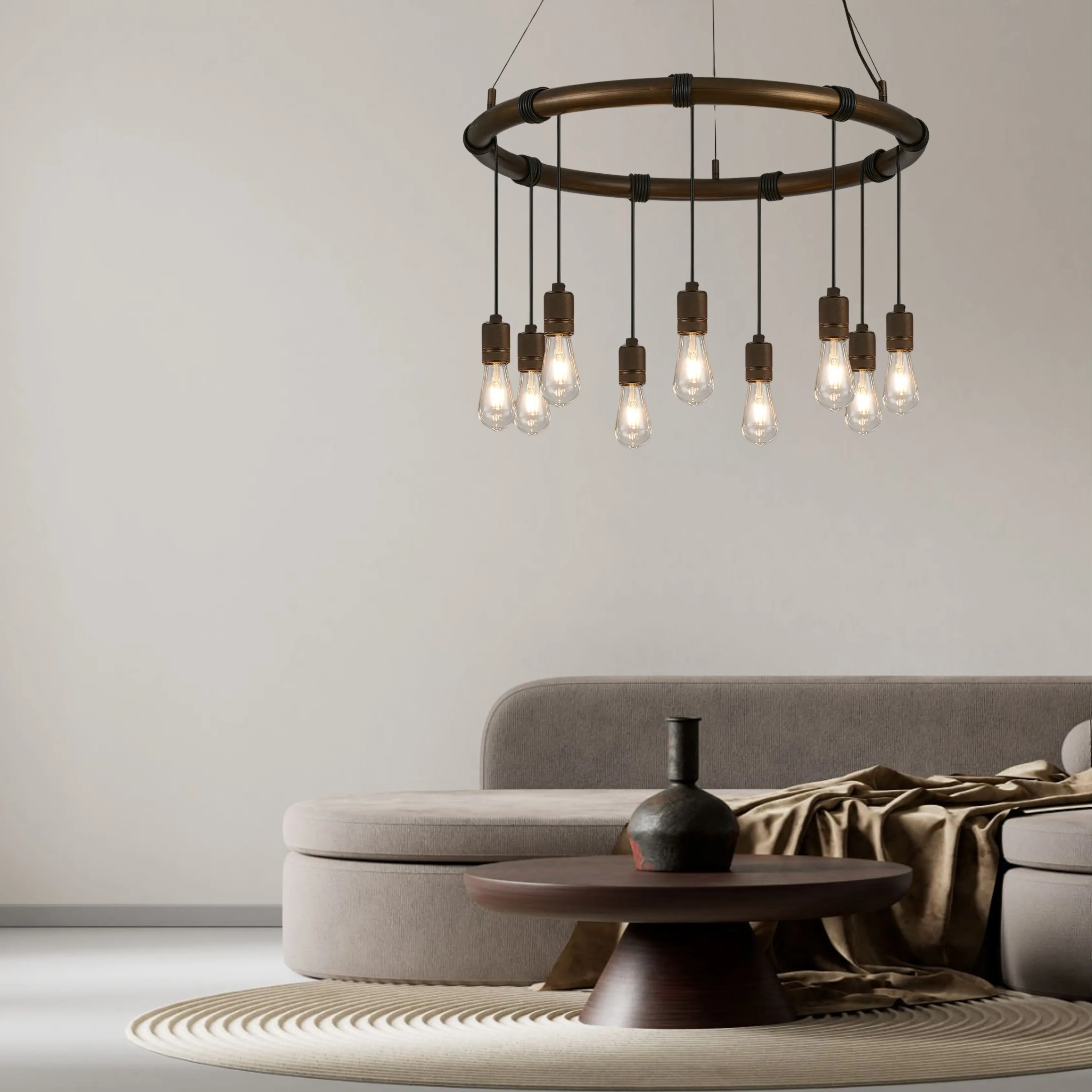 Combining the natural imagery of vines around trees with industrial metallic finishes. The painted matt bronze or pewter frames are wrapped with the black cable and amplified by the textured knurled effect on each E27 lampholder. Available as a variety of pendants and complementing wall lamp, table or floor lamp, this range blends design and industry.