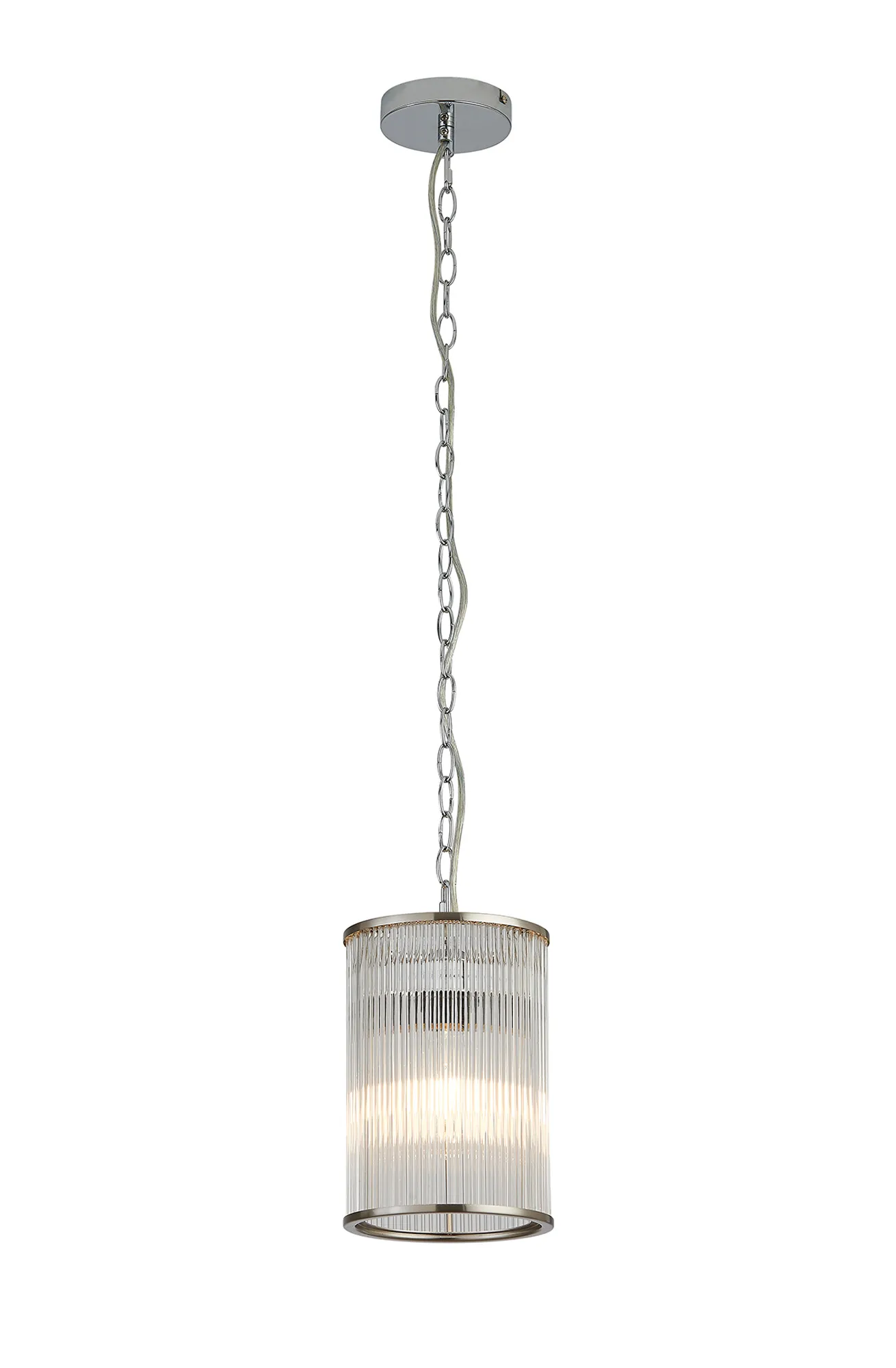 A collection of cylindrical shades featuring metallic edging and clear glass rods. The substantial sizes of these shades allow them to make a dramatic statement regardless of the lighting fixture they are used on. Each shade is available in five colour finishes; antique brass, french gold, polished nickel, satin black or satin nickel.