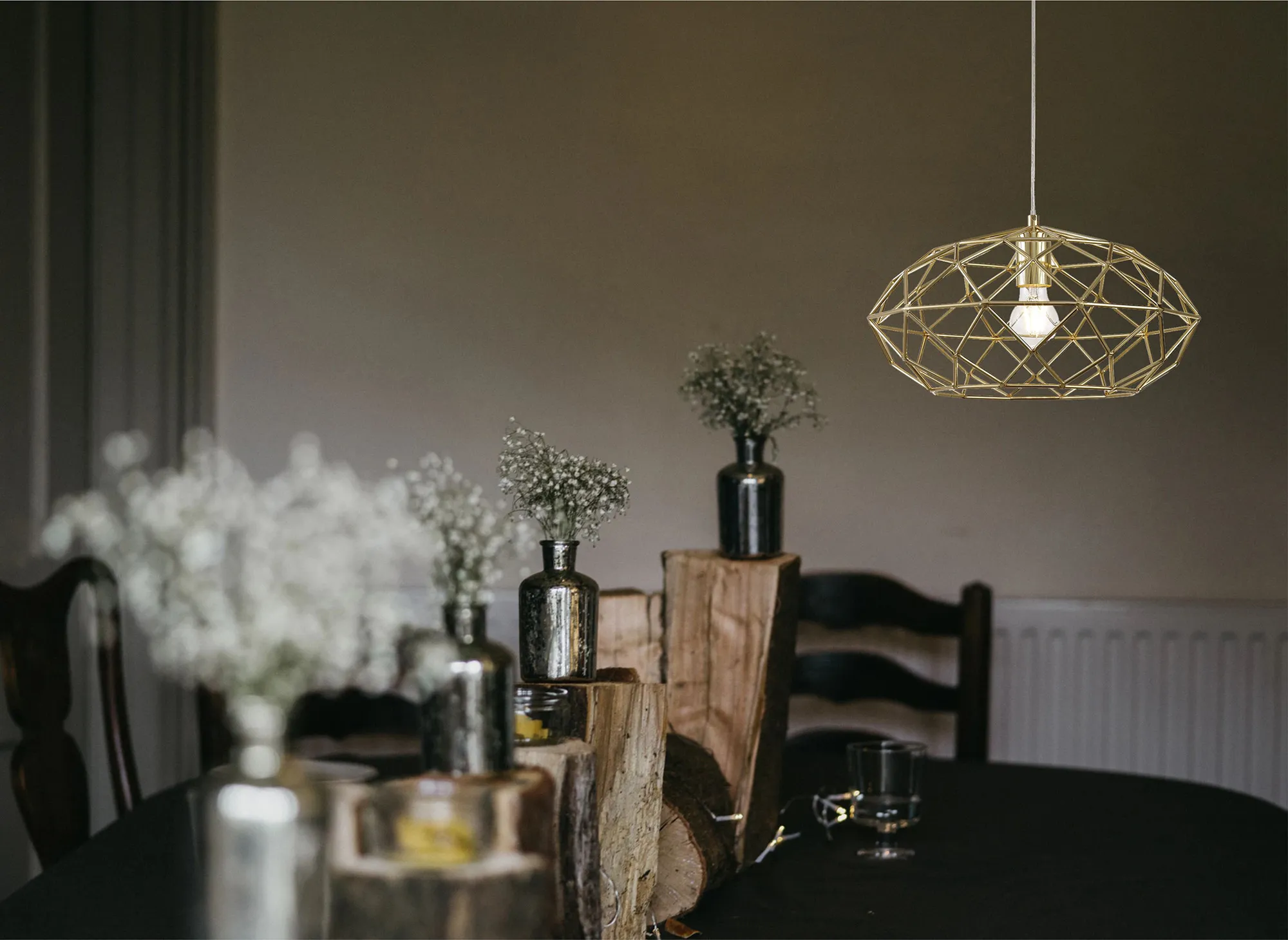 The Elsa collection is comprised of a trio of traditional lights, two pendants and one flush ceiling, each with their own unique shape. A body of open triangular and diamond shapes are tiled together to create a prismatic optical illusion around the singular E27 lamp holders. A traditional polished brass finish ensures Elsa can be used to enhance the character and eye-catching design of a rustic of contemporary setting with optimum illumination.