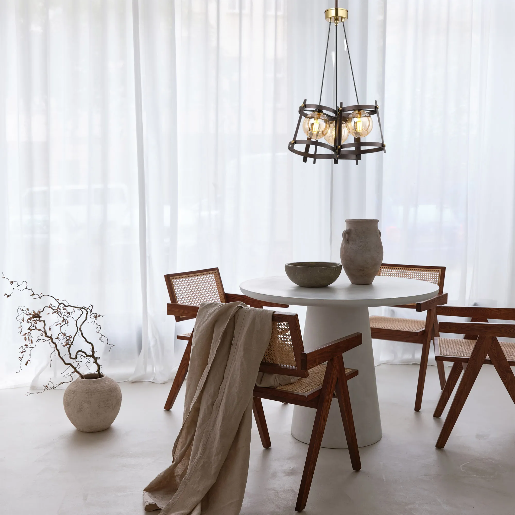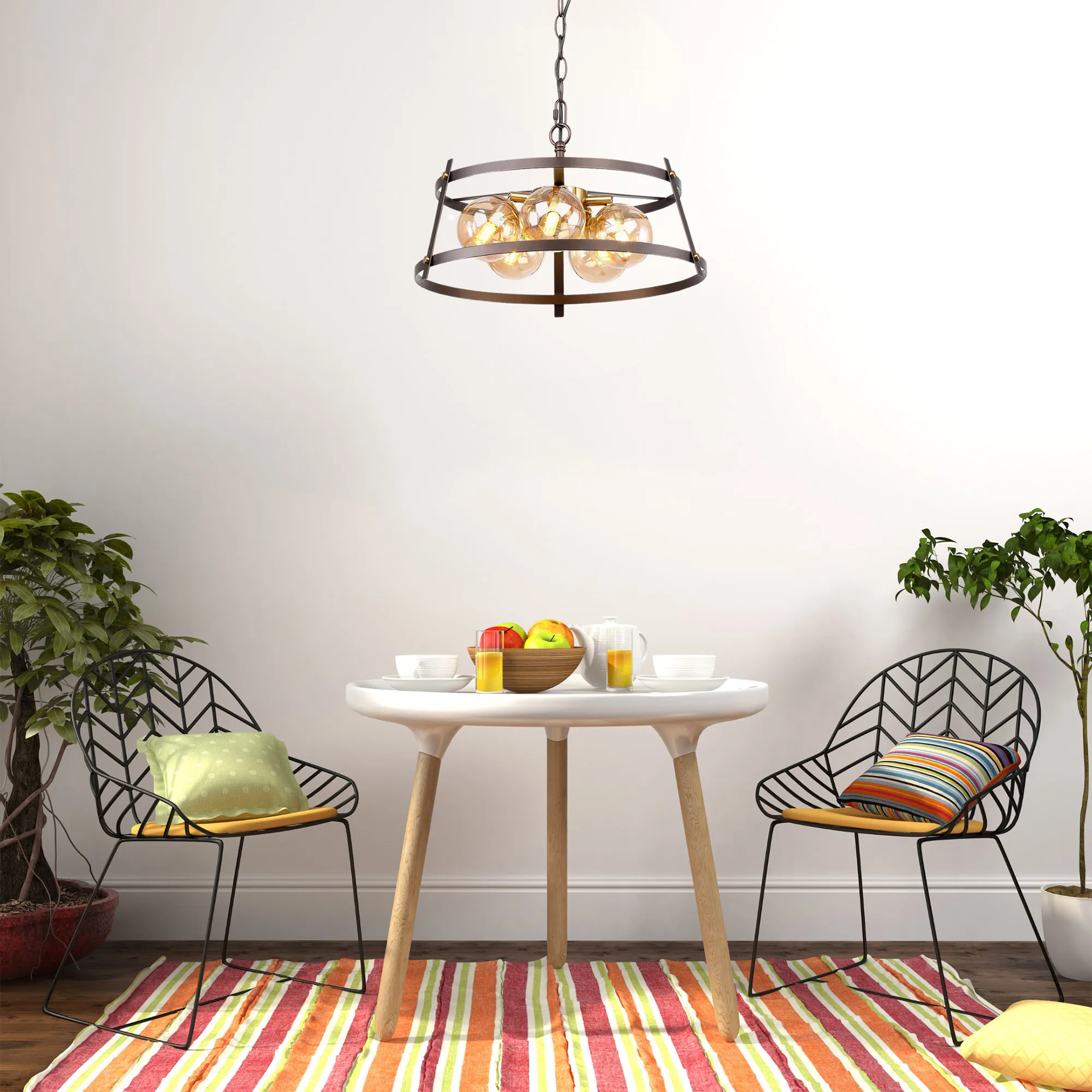 Veggiano pendants present an industrial type aesthetic which showcases the brown oxide open framework that is shaped into a flat top cone and mimics the outline of a traditional shade. Within these structures, the G9 lamp holders are individually sat within cognac globe shaped glass. Each fixed pendant combines the darker brown oxide hue with metallic bronze components creating an attractive contrast.